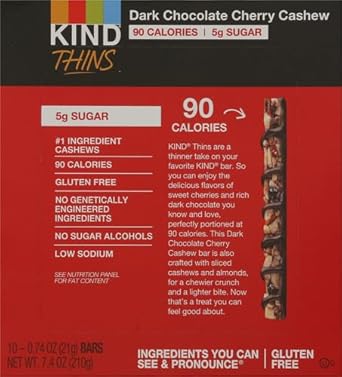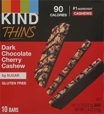 Kind Thins Dark Chocolate Cherry Cashew Bars Are A Thinner Take On Your Favorite Kind Bar. With Cashews As The Number 1 Ingredient, These Gluten Free Bars Feature A Thin Layer Of Sliced Cashews With A Chocolatey Coating And Drizzle. These Snack Bars Contain 5 Grams Of Sugar And 90 Calories Per Serving