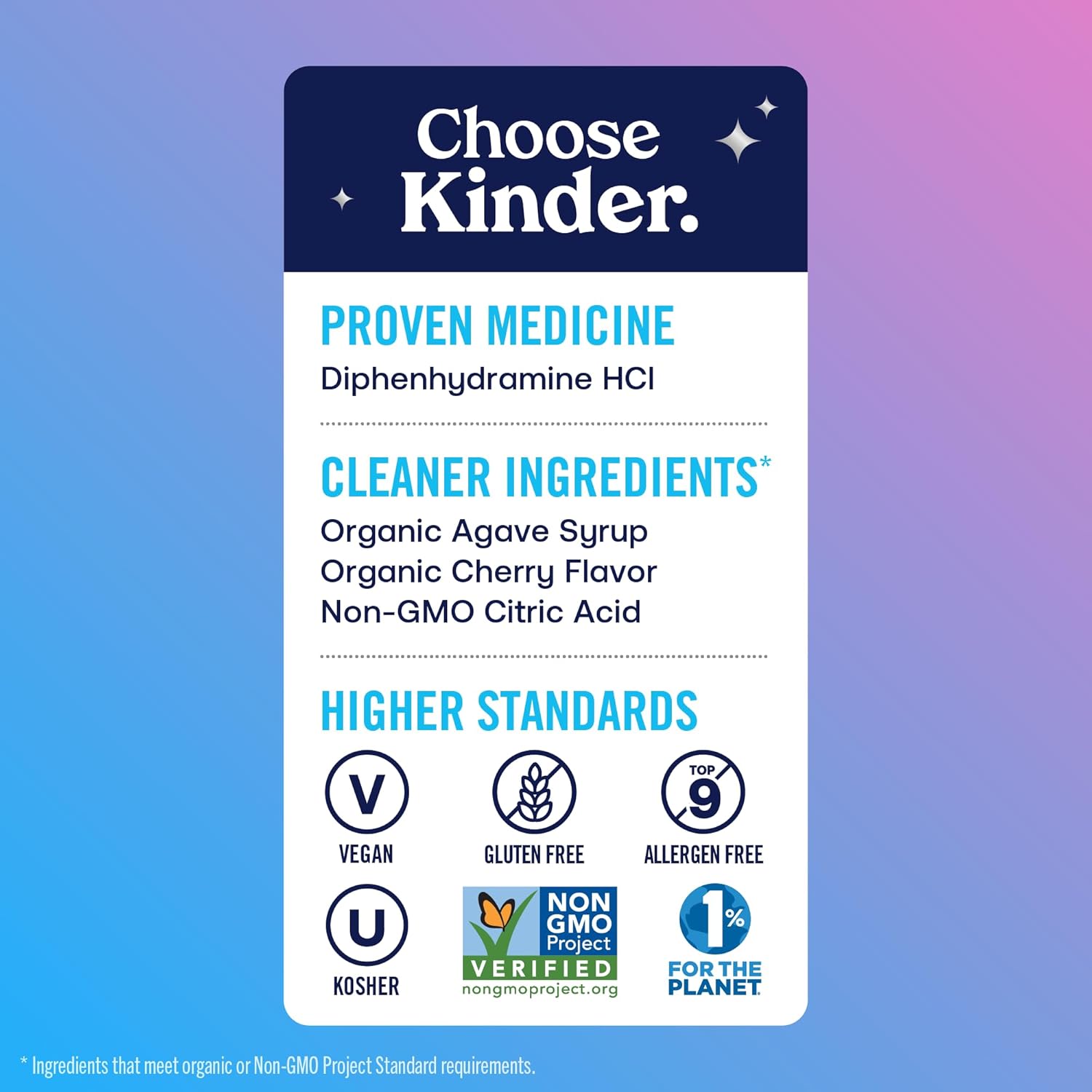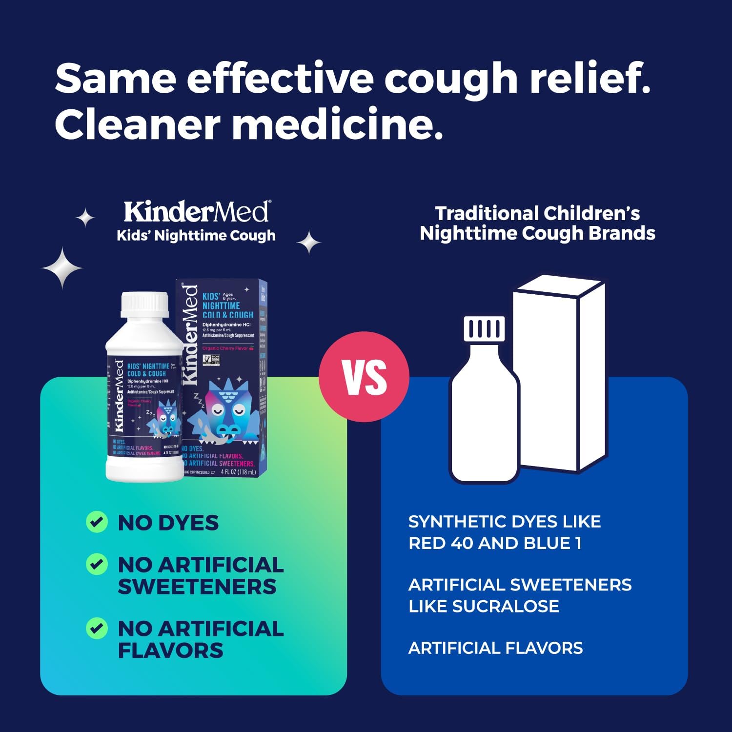About this item REAL MEDICINE, KINDER INGREDIENTS – KinderMed Kids’ Nighttime Cold & Cough is made with an effective, active ingredient (diphenhydramine HCl) and without dyes, parabens, artificial sweeteners or flavors, so you can trust it to provide safe and effective relief for your child. TEMPORARILY RELIEVES NIGHTTIME COLD & COUGH SYMPTOMS – Nighttime medicine that temporarily relieves sneezing, runny nose, itching of the nose or throat, and intensity of coughing in ages 6+. DOCTOR-FORMULATED AND KID-APPROVED – KinderMed Kids' Nighttime Cold & Cough is doctor-formulated with only 5 ingredients, including an organic cherry flavor that's delicious and kid-approved. KinderMed is a Non-GMO Project Verified, vegan, gluten-free and kosher. BE THE CHANGE – Every purchase gives back! KinderFarms partners with 1% for the Planet to support the wellbeing of families around the world. FOUNDED BY PARENTS, BACKED BY SCIENCE – KinderFarms, the kinder “farmaceutical” company, was founded by parents, Jessica Biel and Jeremy Adams, when they couldn’t find health products that were both effective and fit with their values. KinderFarms uses proven science to create clean products that are kinder to children, animals, and the planet.  See more product details,REAL MEDICINE, KINDER INGREDIENTS – KinderMed Kids’ Nighttime Cold & Cough is made with an effective, active ingredient (diphenhydramine HCl) and without dyes, parabens, artificial sweeteners or flavors, so you can trust it to provide safe and effective relief for your child,TEMPORARILY RELIEVES NIGHTTIME COLD & COUGH SYMPTOMS – Nighttime medicine that temporarily relieves sneezing, runny nose, itching of the nose or throat, and intensity of coughing in ages 6+,DOCTOR-FORMULATED AND KID-APPROVED – KinderMed Kids' Nighttime Cold & Cough is doctor-formulated with only 5 ingredients, including an organic cherry flavor that's delicious and kid-approved. KinderMed is a Non-GMO Project Verified, vegan, gluten-free and kosher,BE THE CHANGE – Every purchase gives back! KinderFarms partners with 1% for the Planet to support the wellbeing of families around the world,FOUNDED BY PARENTS, BACKED BY SCIENCE – KinderFarms, the kinder “farmaceutical” company, was founded by parents, Jessica Biel and Jeremy Adams, when they couldn’t find health products that were both effective and fit with their values. KinderFarms uses proven science to create clean products that are kinder to children, animals, and the planet