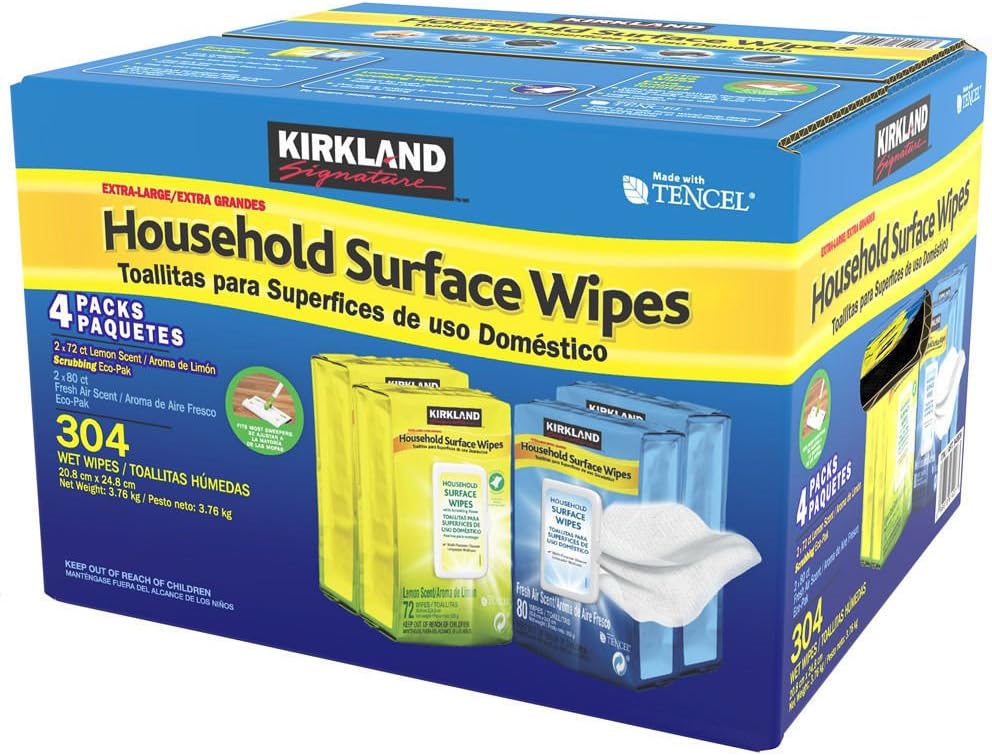 Ingredients: Kirkland Signature Household Surface Extra Large Disinfect Wipes are a great one-step system for cleaning, disinfecting and deodorizing multiple surfaces throughout your home, including common kitchen and bathroom surfaces. The disinfecting wipes are perfect to wipe out 99.9 percent germs/bacteria and comes in a convenient and portable eco-pak that is easier to dispense, easier to store and uses less plastic