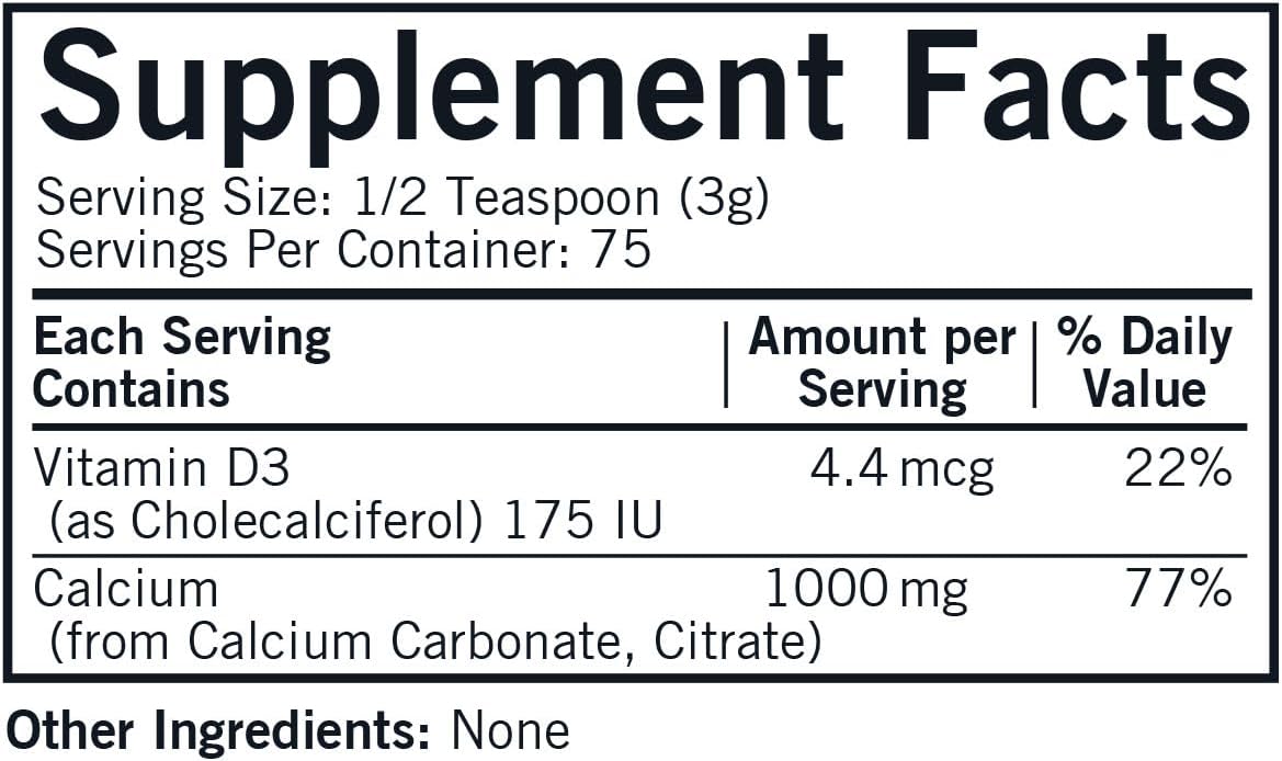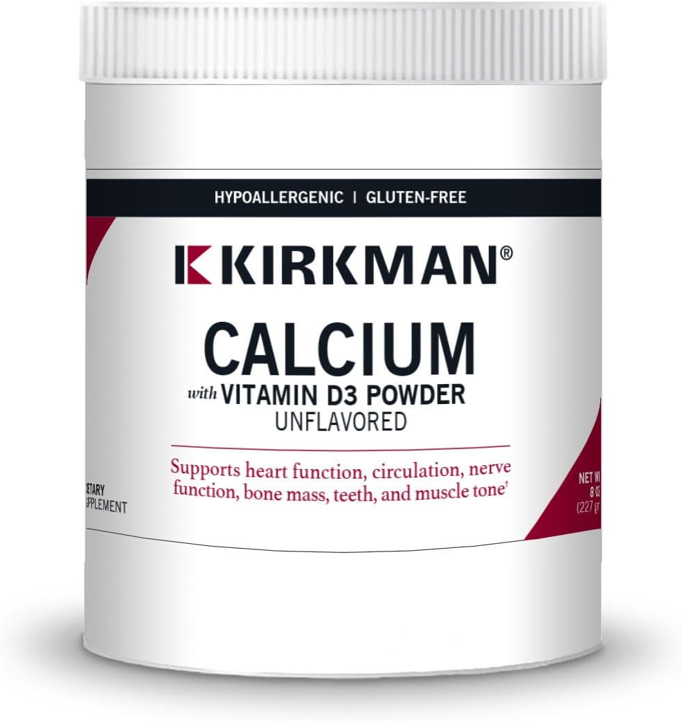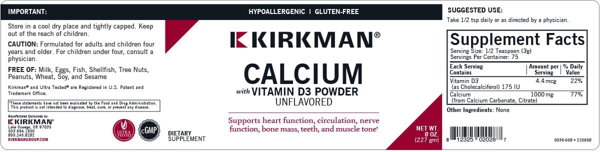 About this item POWERFUL CALCIUM SUPPLEMENT: Formulated with 1000 mg of calcium and 4.4 mg of Vitamin D3 per serving to help support heart function, nerve function, bone mass and muscle tone.* SUPPORTS FOUNDATIONAL HEALTH: Calcium is an essential mineral and necessary for a stable diet. Its importance goes beyond building and maintaining strong bones and teeth. Vitamin D helps increase the absorption of calcium.* EASY TO CONSUME: Take half a teaspoon daily or as directed by a physician. Kirkman Calcium Powder is unflavored and mixes easily in food or beverages and can be used in baking at moderate temperatures.* ULTRA TESTED: Our Ultra Tested standards far exceed industry standards and government requirements.* HYPOALLERGENIC: Does not contain gluten, casein, milk, eggs, peanuts, tree nut allergens, fish allergens, shellfish, soy, wheat, and sesame. See more product details,POWERFUL CALCIUM SUPPLEMENT: Formulated with 1000 mg of calcium and 4.4 mg of Vitamin D3 per serving to help support heart function, nerve function, bone mass and muscle tone,SUPPORTS FOUNDATIONAL HEALTH: Calcium is an essential mineral and necessary for a stable diet. Its importance goes beyond building and maintaining strong bones and teeth. Vitamin D helps increase the absorption of calcium,EASY TO CONSUME: Take half a teaspoon daily or as directed by a physician. Kirkman Calcium Powder is unflavored and mixes easily in food or beverages and can be used in baking at moderate temperatures,ULTRA TESTED: Our Ultra Tested standards far exceed industry standards and government requirements,HYPOALLERGENIC: Does not contain gluten, casein, milk, eggs, peanuts, tree nut allergens, fish allergens, shellfish, soy, wheat, and sesame