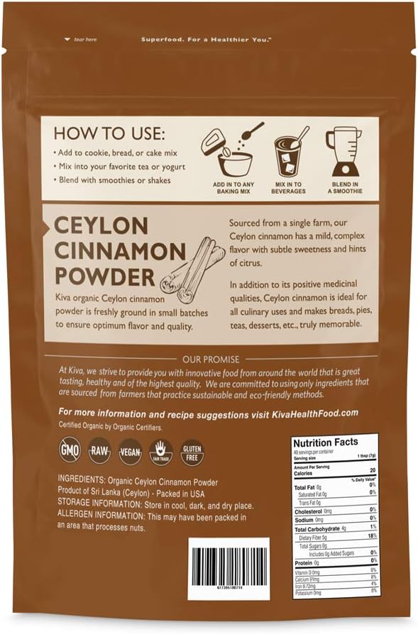 Our Ceylon Cinnamon Is 100% Organic, Non-Gmo, Raw, Vegan And Fair Trade. Our Kiva Organic Ceylon Cinnamon Powder Is Freshly Grounded In Small Batches To Insure Optimum Flavor And Quality. Unlike The Very Strong And Spicy Taste Of The Cheaper Cassia Cinnamon Varieties Sold In Stores, Our True Ceylon Cinnamon Has A Mild, Complex Flavor With Hints Of Citrus And A Subtle Sweetness. In Addition To Its Positive Medicinal Qualities, Our Ceylon Cinnamon Is Ideal For All Culinary Uses And Makes Breads, Pies, Teas, Desserts, Etc. Truly Memorable. Imported Directly From Ceylon And Sourced From A Single Farm. About Kiva: At Kiva, We Strive To Provide You With Innovative Food From Around The World That Is Great Tasting, Healthy And Of The Highest Quality. We Are Committed To Using Only Ingredients That Are Sourced Directly From Local Farmers That Practice Sustainable Methods