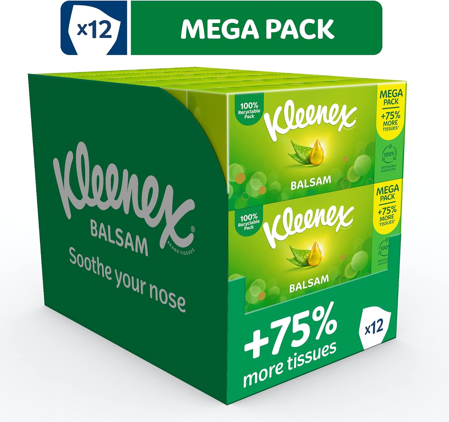 Kleenex® Balsam Tissues, Mega Pack - 1,344 Sheets (12 Boxes X 112 Sheets) - Balm Tissues Protect And Soothe Your Nose When You'Ve Got A Cold - Balmcare® With Aloe Vera, Vitamin E And Calendula
