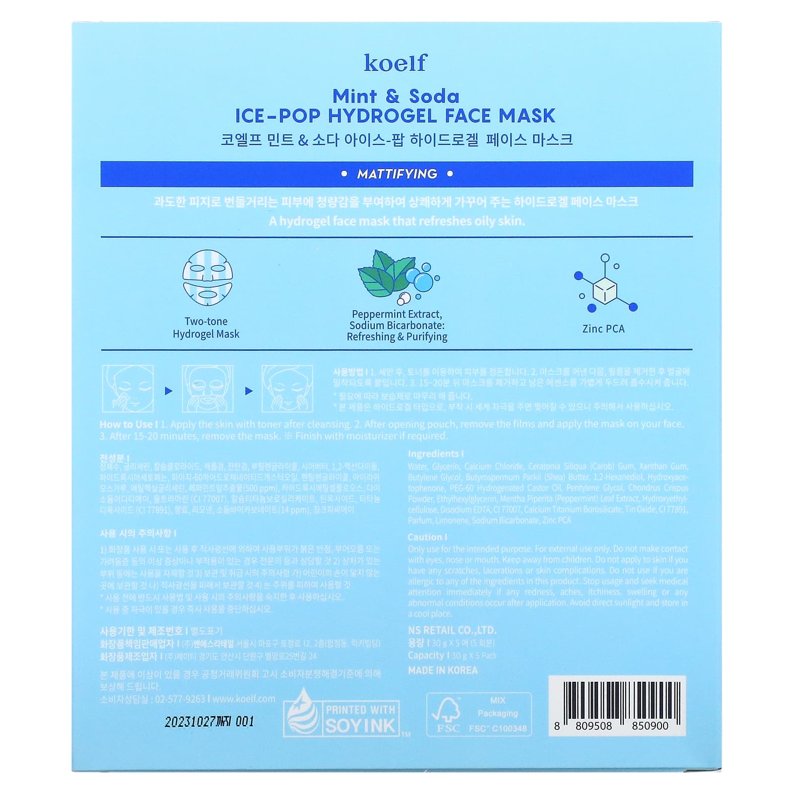 Koelf, Ice-Pop Hydrogel Beauty Face Mask, 5 Sheets, 30 G Each