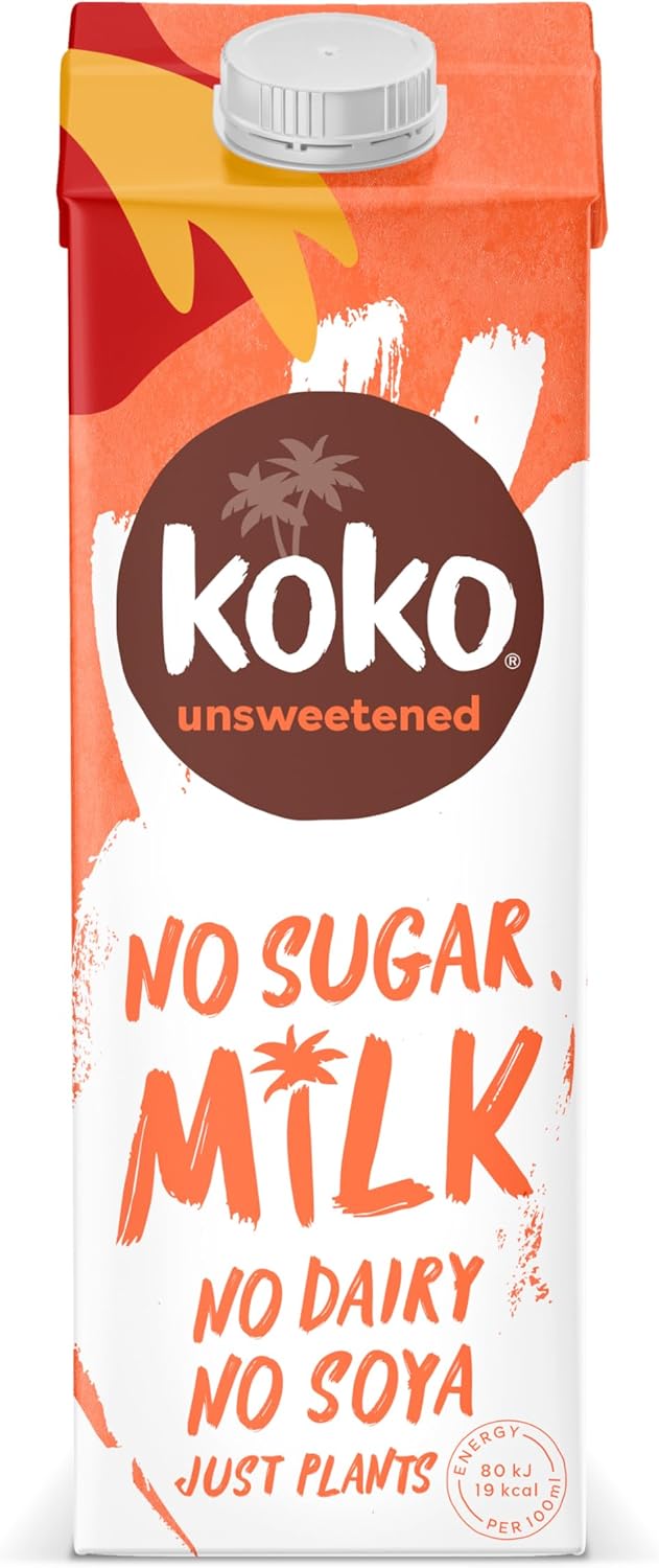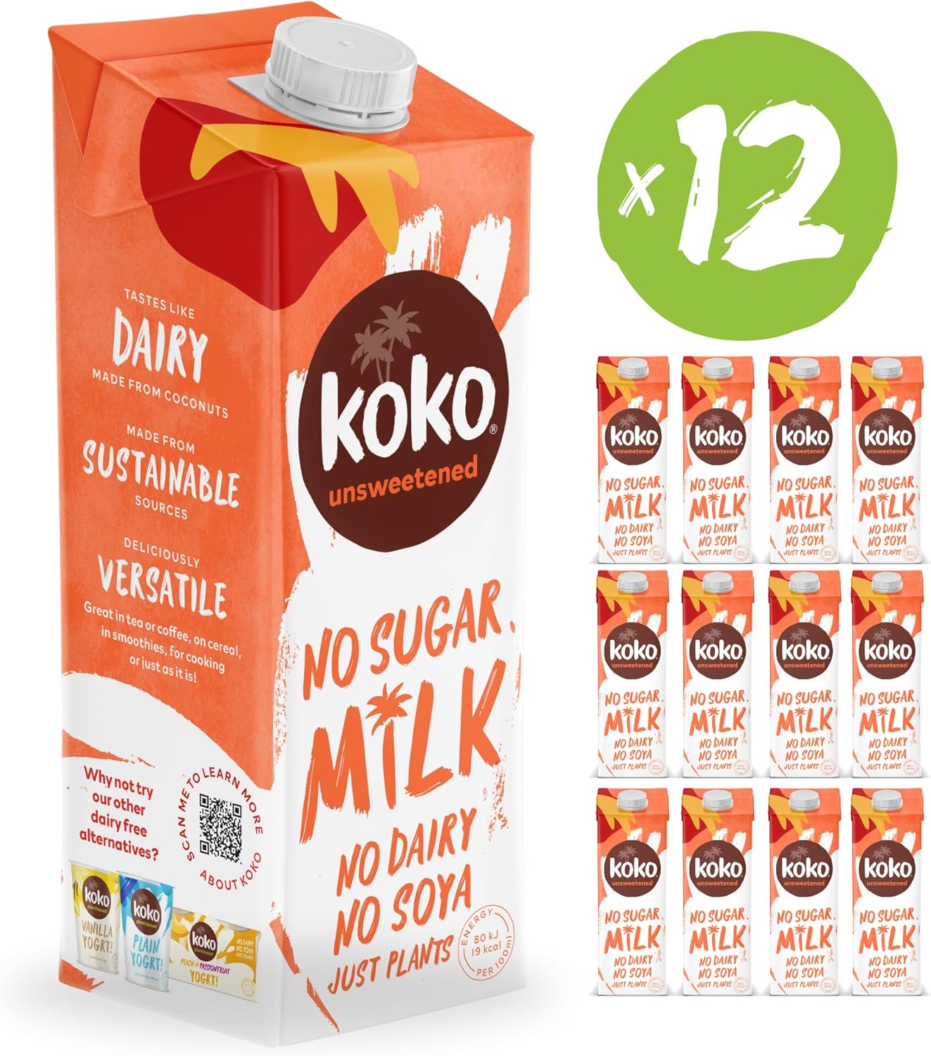 Koko Unsweetened No Sugar Mlk 12 X 1L | Tastes Like Dairy & No Added Sugar | No Dairy, No Soya, Just Plants | Allergen Free | Uht Ambient Long Life | 19 Calories Per 100Ml