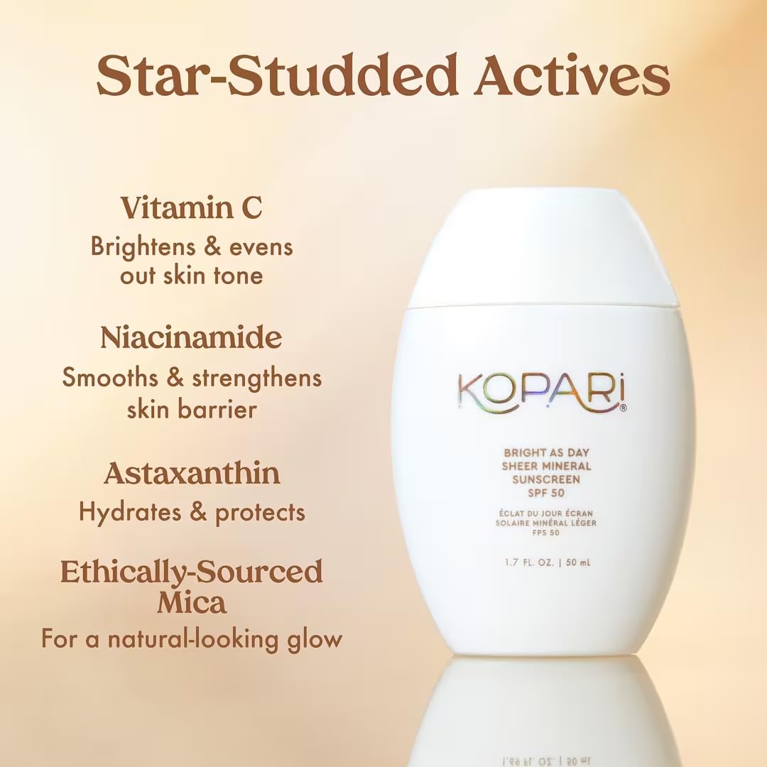 Kopari Bright As Day Sheer Mineral Sunscreen Spf 50, 100% Mineral Facial Sunscreen With Vitamin C & Niacinamide, Sheer Finish, All Skin Tones, 1.7 Oz
