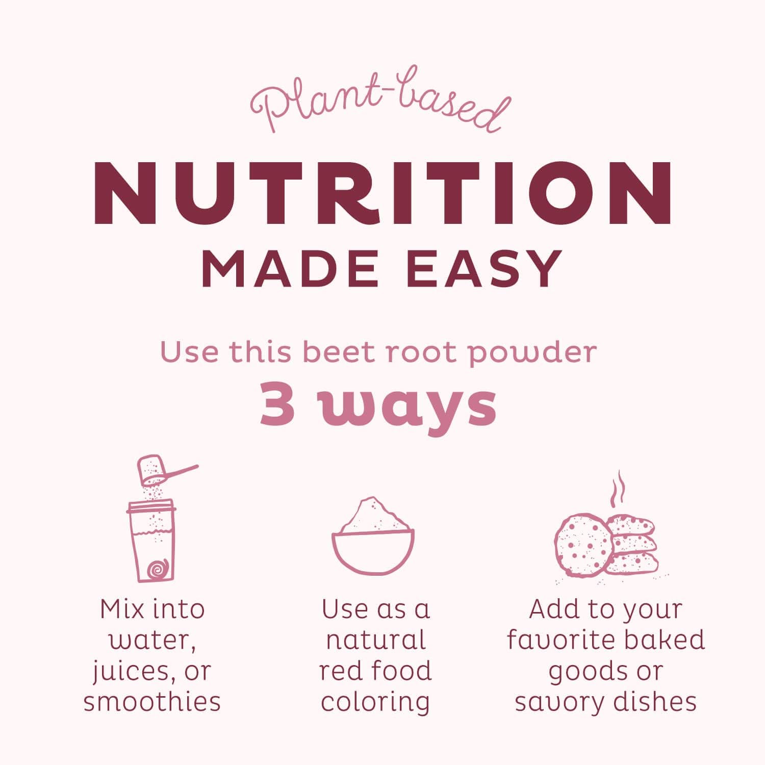 Antioxidant Root Food: Beets are a crazily effective anti-oxidant wonder food, brawling with free radicals and boldly inserting their Beet Super Powers between your cowering cells and the oxidative strain which would otherwise destroy them10Betalains Explained: Betanin and vulgaxanthin, prominent in beet mojo. These phytonutrients are in a class called betalains which are known to promote a healthy cardiovascular system10Circulation Magic: Beets (okay it's just beet powder) are known to increase nitric oxide in the body. This is great news for your endothelium; the micro-thin lining of your entire vascular system and major player in the blood pressure game10Oxygen Rabbit Pulled From Hat: Beetroot powder, naturaly nitrate rich, is turned to nitric oxide when consumed. Then absorbed into the bloodstream to work their oxygen-boosting magic, through processes that are still under investigation10We Got the Beet: Enjoy that freaky-looking, bright red disc in the middle of your plate โ or easily mix beetroot powder into smoothies, juice or water1010