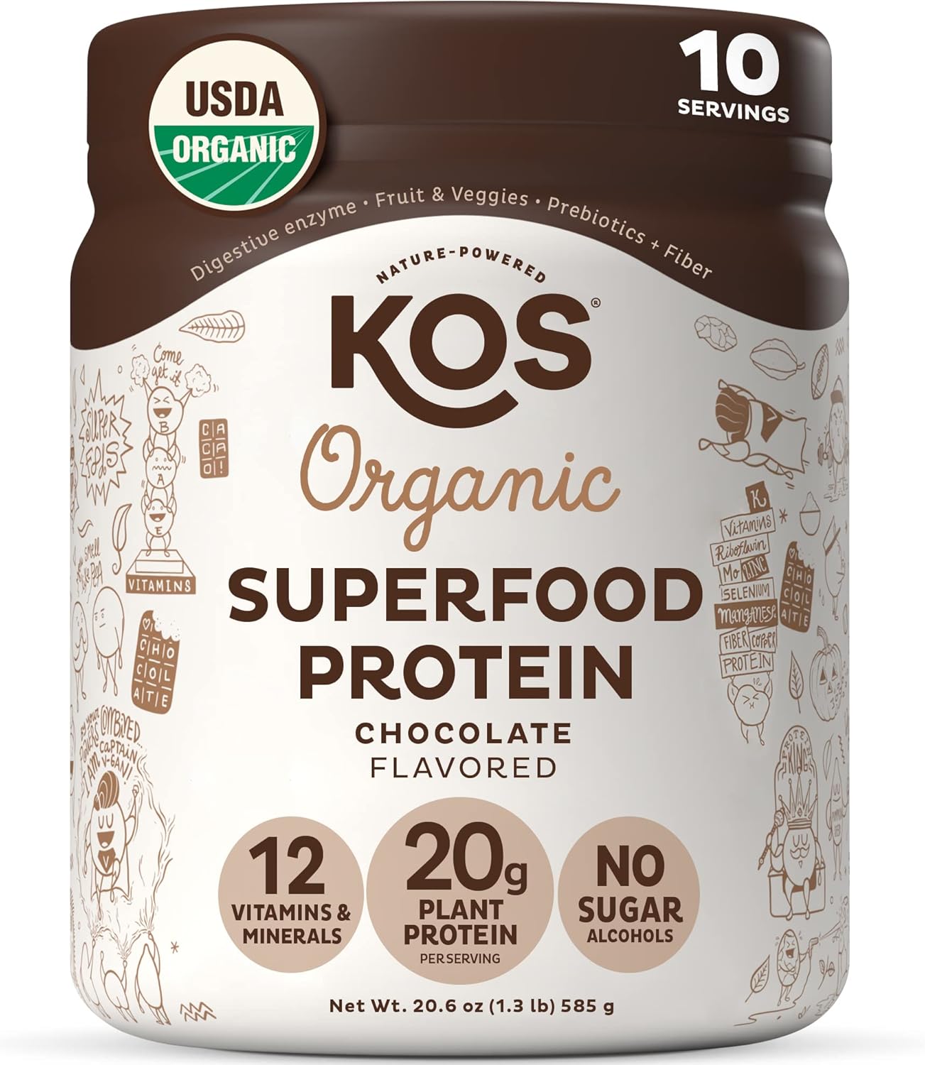 Kos Vegan Protein Powder, Chocolate Usda Organic - Low Carb Pea Protein Blend, Plant Based Superfood With Vitamins & Minerals - Keto, Soy, Gluten Free - Meal Replacement For Women & Men - 10 Servings