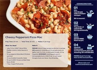 KRAFT MACARONI & CHEESE: One 11.9 oz box of Kraft Deluxe White Cheddar & Garlic & Herbs Macaroni & Cheese Dinner10RICH & CREAMY: Help yourself to a warm, comforting bowl of our rich and creamy mac and cheese, made with white cheddar cheese, garlic and herbs10REAL CHEESE: Deliciously real, our sauce is made with real cheese for the ultimate feel-good food10ALL SMILES: Hearty, ridged macaroni noodles are covered in creamy cheese to wrap you in comfort and put a smile on your face10REAL FLAVOR: Made with no artificial flavors or dyes, Kraft Deluxe White Cheddar & Garlic & Herbs Macaroni & Cheese lifts you up and makes you happy inside10Help yourself to a bowl of comfort with Kraft Deluxe White Cheddar & Garlic & Herbs Macaroni & Cheese Dinner. Rich and creamy, our dinner is made with ridge macaroni, real white cheddar cheese sauce, garlic and herbs. Our dinner contains no artificial flavors or dyes for a deliciously real meal. Kraft Deluxe is a quick and easy meal, perfect for families. To prepare, simply boil noodles for 11-12 minutes, drain and add to the pan, then squeeze in cheesy sauce, butter and milk and stir. Eat it with meatloaf or mix in your favorite green veggie for an even better bite. Don't be fooled by the new packaging, our Kraft Deluxe Mac and Cheese still has the same contagiously positive and delicious taste. Each 11.9 oz box makes about 4 servings so everybody can enjoy our noodlefuls of delight. Eat something everyone will smile about with Kraft Deluxe Macaroni and Cheese