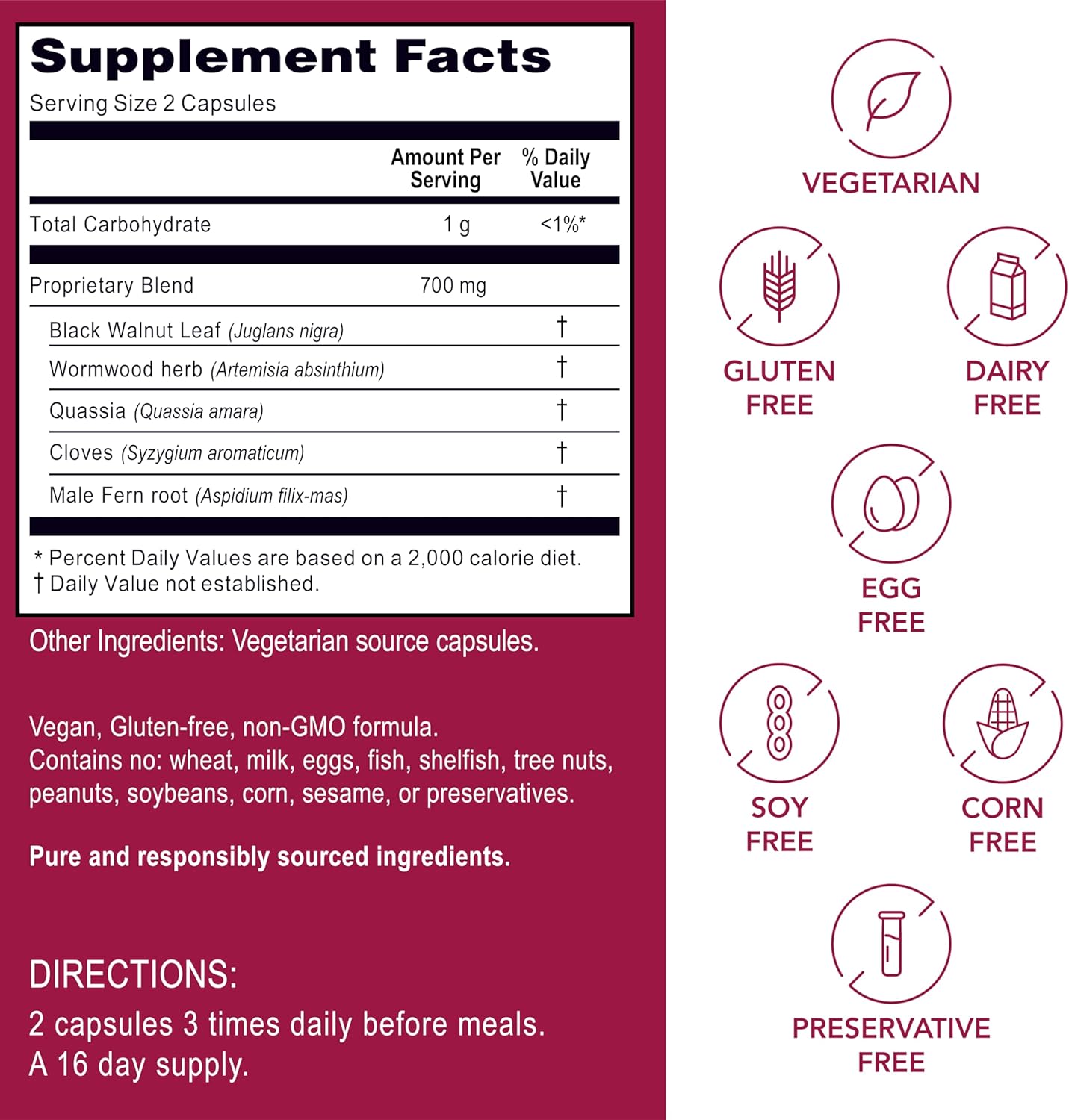 About this item Natural Antioxidants - Black Walnut and Wormwood contain naturally-occuring antioxidants for daily wellness and cleansing nutrients.* Black walnut contains active ingredients including omega-3 fatty acids, sterols and tannins. Liver Health Support - Wormwood is a powerful antioxidant that can help maintain healthy liver function.* The liver helps the body remove toxins and converts nutrients from our body into substances we can use. Colon Cleanse & Flora Friendly - Helps cleanse the colon and support healthy intestinal flora balance in the body.* Some of the active substances found in wormwood are thujone, silica, tannins, flavonoids, and inulin. It also contains absinthian. Certifications/Classifications - Soy Free, Vegan, Gluten Free, Dairy Free, Egg Free, Corn Free. Our non-GMO Wormwood capsules are organic or wildcrafted, vegetarian and bioavailable for optimal absorption. Free from artificial colors, fillers, binders & additives. Manufactured In The USA - Family owned and operated company since 1978, experience superior standards in herbal supplements as each batch of our wormwood supplements are proudly manufactured in the USA with purity testing. Irradiation free. See more product details,Natural Antioxidants - Black Walnut and Wormwood contain naturally-occuring antioxidants for daily wellness and cleansing nutrients.* Black walnut contains active ingredients including omega-3 fatty acids, sterols and tannins,Liver Health Support - Wormwood is a powerful antioxidant that can help maintain healthy liver function.* The liver helps the body remove toxins and converts nutrients from our body into substances we can use,Colon Cleanse & Flora Friendly - Helps cleanse the colon and support healthy intestinal flora balance in the body.* Some of the active substances found in wormwood are thujone, silica, tannins, flavonoids, and inulin. It also contains absinthian,Certifications/Classifications - Soy Free, Vegan, Gluten Free, Dairy Free, Egg Free, Corn Free. Our non-GMO Wormwood capsules are organic or wildcrafted, vegetarian and bioavailable for optimal absorption. Free from artificial colors, fillers, binders & additives,Manufactured In The USA - Family owned and operated company since 1978, experience superior standards in herbal supplements as each batch of our wormwood supplements are proudly manufactured in the USA with purity testing. Irradiation free