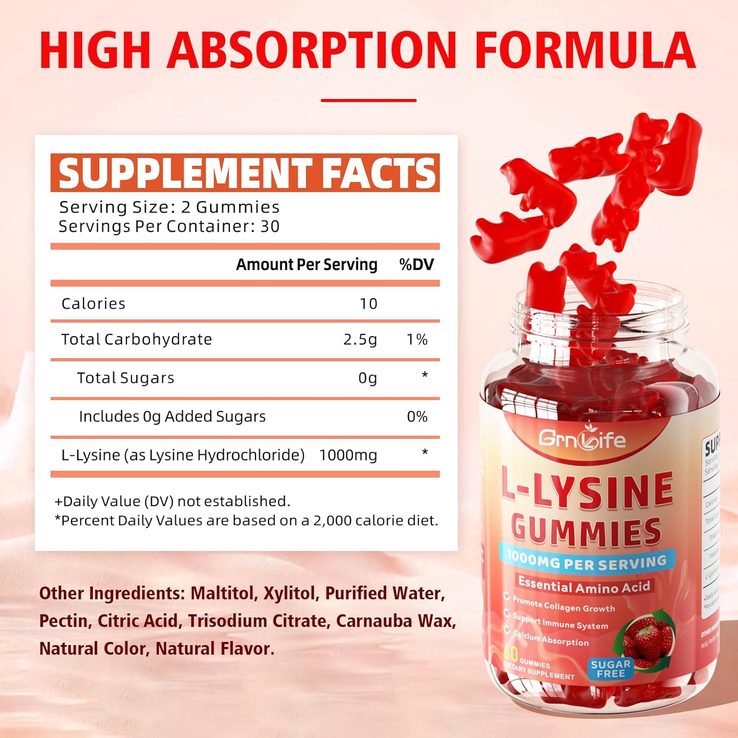 About this item L-LYSINE 1000MG SUPPLEMENT: Each 2 gummies contains 1000mg of L-Lysine, providing a powerful boost to your daily health. Incorporate it into your routine to enhance your overall well-being! HEALTH OF L-LYSINE: L lysine, an essential amino acid, plays a pivotal role in strengthening your body's natural defense mechanisms and it helps your immune cells function optimally, supports lip and mouth health, enhances the immune system, and promotes collagen production for adults and children. MUSCLE SUPPORT: Lysine plays a crucial role in protein synthesis and is important for growth, tissue repair, and the production of enzymes. It also plays a significant role in the formation and maintenance of muscle tissue. L-LYSINE FOR ADULTS KIDS: The l lysine gummies are suitable for both adults and children. They have a comfortable texture after chewing and can be swallowed without water or food, allowing for quick absorption by the digestive system and gentle on the stomach. Each bottle contains 60 gummies, providing a 30-day supply. EXCELLENT IN QUALITY: Grnlife lysine gummies comply with GMP standards and have passed laboratory testing. All batches of the product undergo quality assurance at every stage of production. We are always committed to producing the highest quality dietary supplements and being your health partner. See more product details,L-LYSINE 1000MG SUPPLEMENT: Each 2 gummies contains 1000mg of L-Lysine, providing a powerful boost to your daily health. Incorporate it into your routine to enhance your overall well-being!,HEALTH OF L-LYSINE: L lysine, an essential amino acid, plays a pivotal role in strengthening your body's natural defense mechanisms and it helps your immune cells function optimally, supports lip and mouth health, enhances the immune system, and promotes collagen production for adults and children,MUSCLE SUPPORT: Lysine plays a crucial role in protein synthesis and is important for growth, tissue repair, and the production of enzymes. It also plays a significant role in the formation and maintenance of muscle tissue,L-LYSINE FOR ADULTS KIDS: The l lysine gummies are suitable for both adults and children. They have a comfortable texture after chewing and can be swallowed without water or food, allowing for quick absorption by the digestive system and gentle on the stomach. Each bottle contains 60 gummies, providing a 30-day supply,EXCELLENT IN QUALITY: Grnlife lysine gummies comply with GMP standards and have passed laboratory testing. All batches of the product undergo quality assurance at every stage of production. We are always committed to producing the highest quality dietary supplements and being your health partner