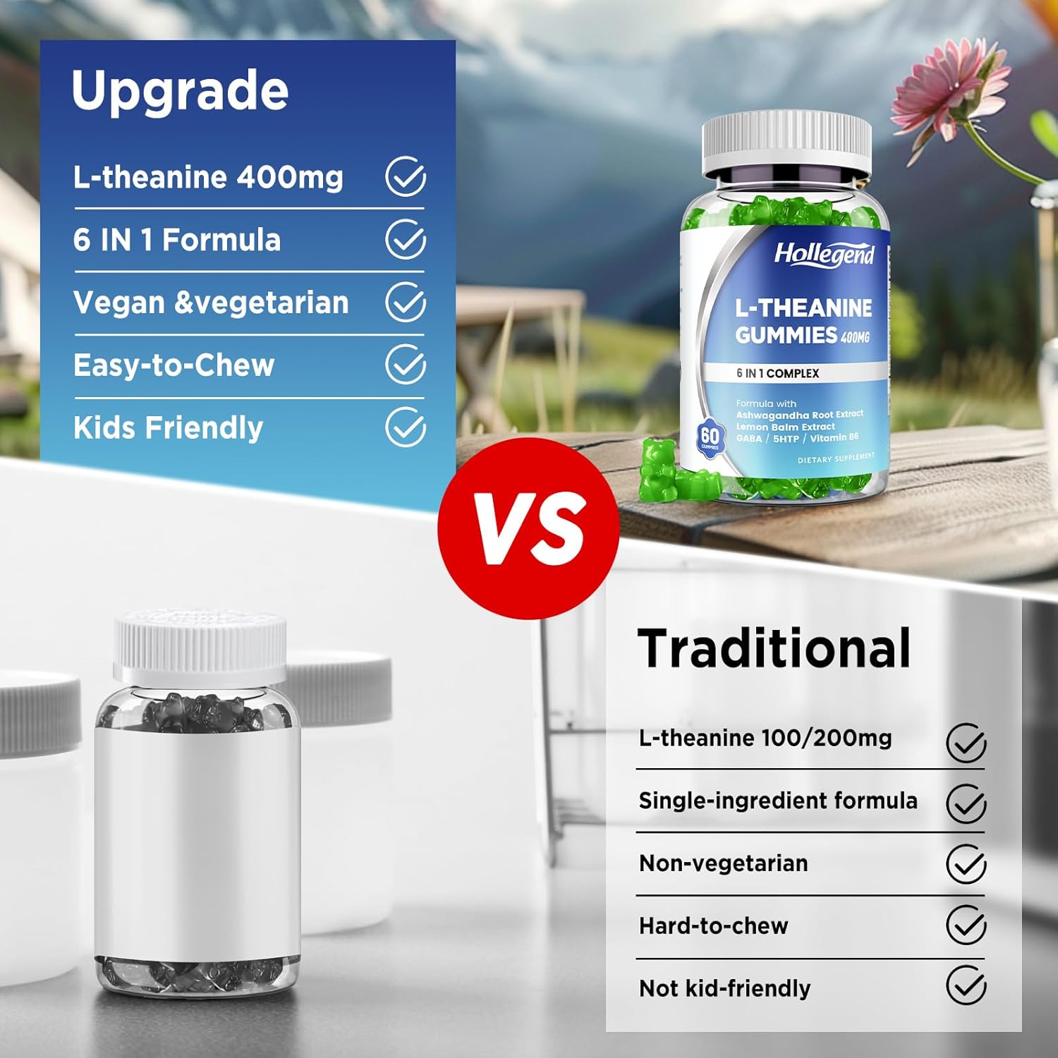 About this item L-Theanine Gummy: L-theanine is a unique amino acid that occurs naturally in the tea plant and processed for relaxing effects. Each bottle comes with 60 delicious gummies 6 in 1 Formula : L-theanine 400mg enhanced with GABA 100mg, ashwagandha 100mg, 5HTP 50mg, lemon balm extract & vitamin B6, A great combination for you to add into your daily routine for body health Multiple Benefits: These plant-powered l-theanine gummies are designed to work with your body to help you ease into a restful Zzz and you can wake up feeling refreshed for the whole day Wonderful Lemon Flavor : Unlike capsules or tablets, our chewable theanine gummies have a Lemon flavor and are more easy to swallow. Recommended to take 1-2 gummies per day Choose with confidence ! : These gummies are made from premium ingredients and manufactured in GMP certified facility. All the gummies are pectin-based, vegan, non-GMO, Gluten Free See more product details,L-Theanine Gummy: L-theanine is a unique amino acid that occurs naturally in the tea plant and processed for relaxing effects. Each bottle comes with 60 delicious gummies,6 in 1 Formula : L-theanine 400mg enhanced with GABA 100mg, ashwagandha 100mg, 5HTP 50mg, lemon balm extract & vitamin B6, A great combination for you to add into your daily routine for body health,Multiple Benefits: These plant-powered l-theanine gummies are designed to work with your body to help you ease into a restful Zzz and you can wake up feeling refreshed for the whole day,Wonderful Lemon Flavor : Unlike capsules or tablets, our chewable theanine gummies have a Lemon flavor and are more easy to swallow. Recommended to take 1-2 gummies per day,Choose with confidence ! : These gummies are made from premium ingredients and manufactured in GMP certified facility. All the gummies are pectin-based, vegan, non-GMO, Gluten Free