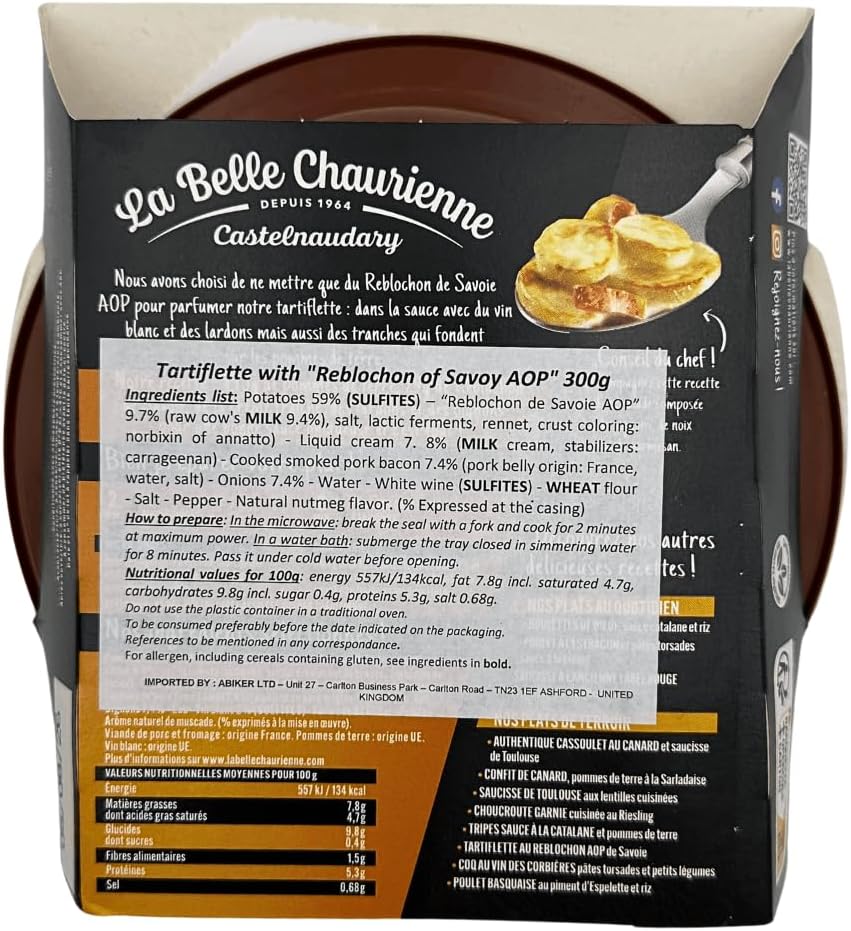 Selection of 4 x 300g La Belle Chaurienne French ready meals. Includes one each of the following: Duck Cassoulet, Confit Duck and Saraladaise Potatoes, Tartiflette and Choucroute Garnie. Confit de Canard features slow-roasted duck, served alongside potatoes roasted in duck fat. Tartiflette is a layered potato dish made with Reblochon cheese and bacon lardons. Choucroute Garnie is salt-pickled cabbage (sauerkraut) garnished with sausage and duck cassoulet is made with French duck, Toulouse sausages and lingot beans. If you love French food but don’t have much time, these ready-meals are perfect and ready in the microwave in minutes,Selection of 4 x 300g French ready meals,Cook these authentic French dishes in your microwave in minutes!,Includes one each of the following: Duck Cassoulet, Confit Duck and Sarladaise Potatoes, Tartiflette and Choucroute Garnie,Made in the South West of France by La Belle Chaurienne,One portion per meal