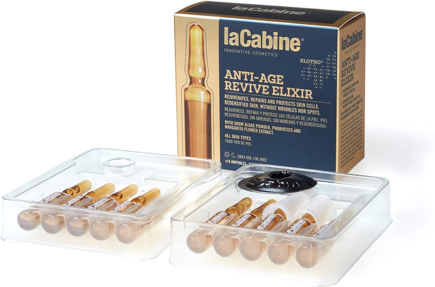 ABOUT THE PRODUCT: 1 > Indicated for intensive anti-wrinkle treatment 2 > Stimulates cellular mechanisms for a radiant appearance 3 > Protects skin youth by activating the longevity geneLa Cabine Anti-Aging Revive Elixir ampoules are indicated for intensive anti-wrinkle treatment. Stimulates cellular mechanisms for a radiant appearance. It protects the youth of the skin by activating the longevity gene, called Klotho. Through a mechanism that mimics the effects of caloric restriction on cells, the DNA detoxification and repair genes are activated. Its components act synergistically to enhance our beauty. Pack of 10 of 2 ml