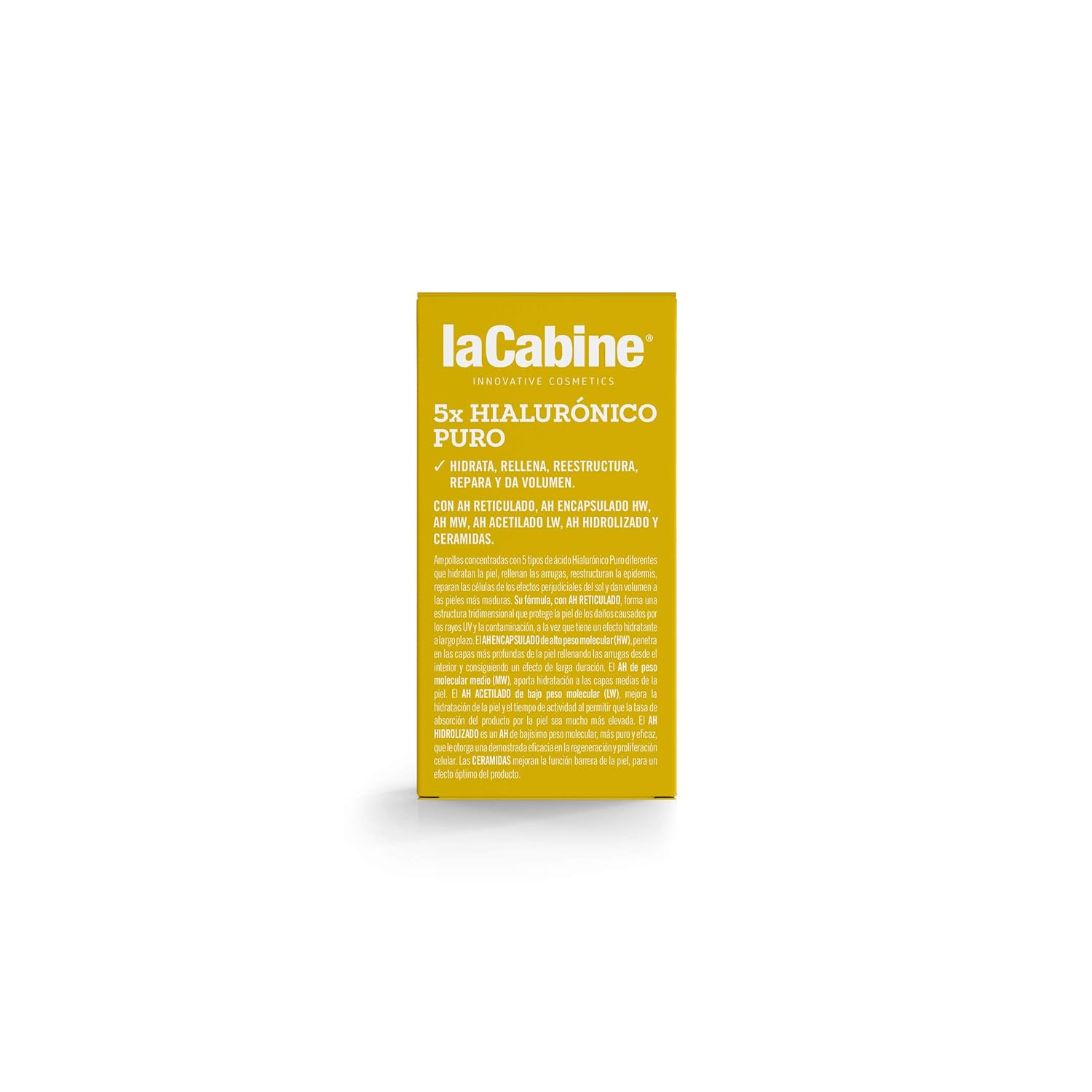 ABOUT THE PRODUCT: 1 > Moisturizes the skin at different levels 2 > It fills wrinkles and restructures the epidermis 3 > Repairs cells from the harmful effects of the sunLa Cabine 5x Pure Hyaluronic are concentrated ampoules with 5 different types of Pure Hyaluronic Acid that moisturize the skin at different levels, fill wrinkles, restructure the epidermis, repair cells from the harmful effects of the sun and give volume to more mature skin