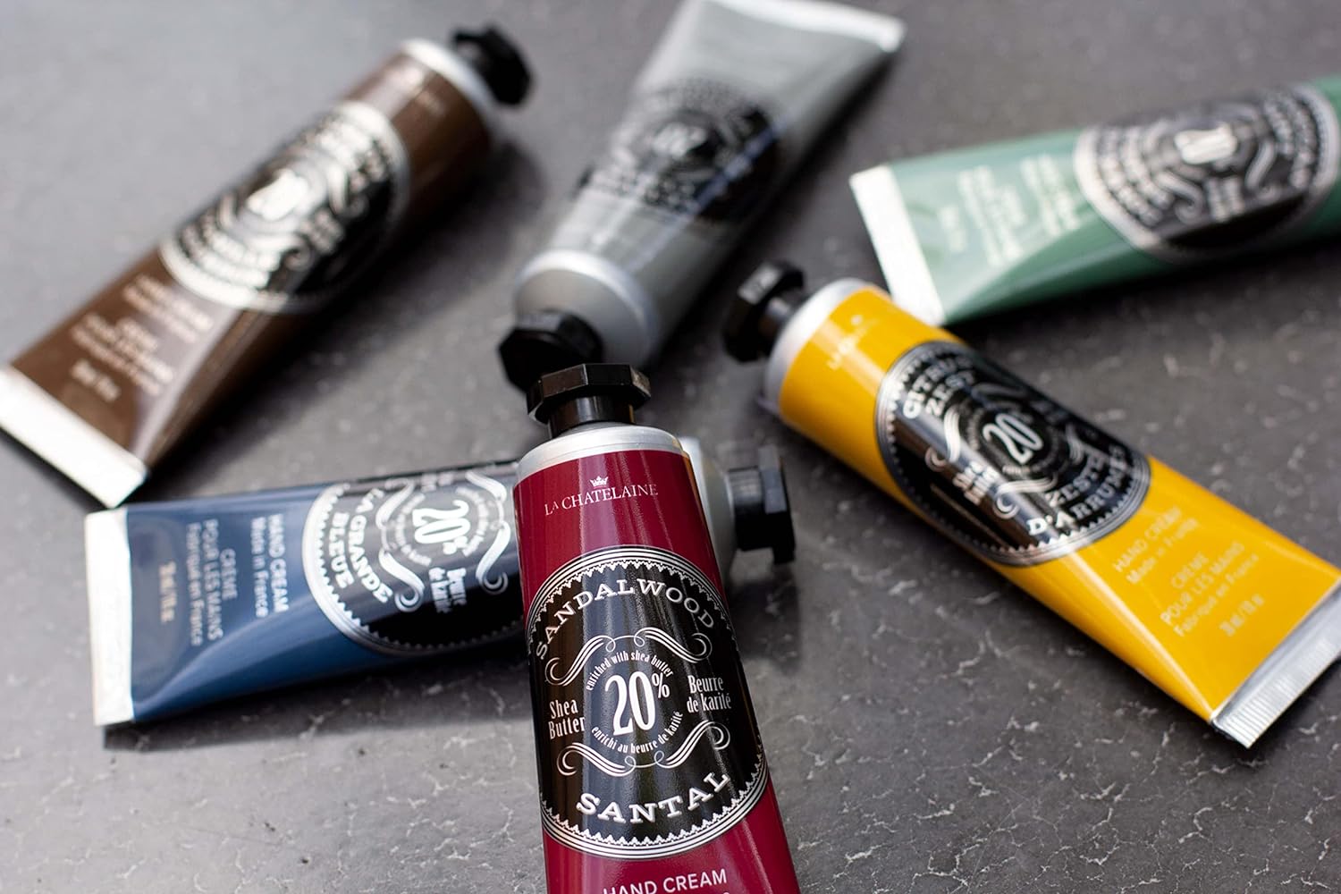 ABOUT THE PRODUCT: 1 > BELOVED BY CUSTOMERS WORLDWIDE… & OPRAH! The family-owned La Chatelaine brand is supported by loyal customers and has been featured on Oprah’s Favorite Things List 2018 and 2019! This must-have Luxury Collection lotion gift set for bath & home with travel tins are the perfect gift set for women, for yourself or your beloved 2 > ULTRA-RICH FORMULA: Blended with a high concentration of 20% organic Shea Butter, Vitamin E and Argan Oil to deeply moisturize, nourish and protect. The creamy texture absorbs quickly for immediate hydration and intense repair, to leave hands soft, smooth and rejuvenated 3 > MOISTURIZE & NOURISH: Because of our rich and sustainable Organic Shea Butter, Argan Oil, and Vitamin E, these premium quality lotions will nourish and hydrate your skin La Chatelaine Hand Cream Trio Tin Gift Set | Unisex | Father's Day Gift | Ready-To-Gift Decorative Tin | Plant-Based | Made in France with 20% Organic Shea Butter (Deep Blue Sea, Sandalwood, Citrus Zest)