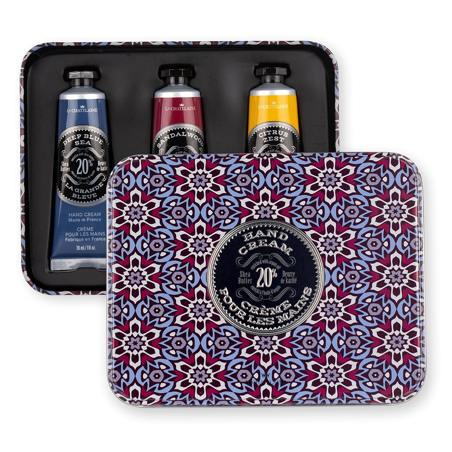 La Chatelaine Hand Cream Trio Tin Gift Set | Unisex | Father's Day Gift | Ready-To-Gift Decorative Tin | Plant-Based | Made in France with 20% Organic Shea Butter (Deep Blue Sea, Sandalwood, Citrus Zest)