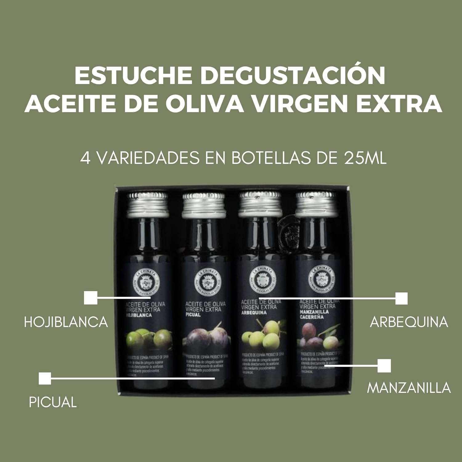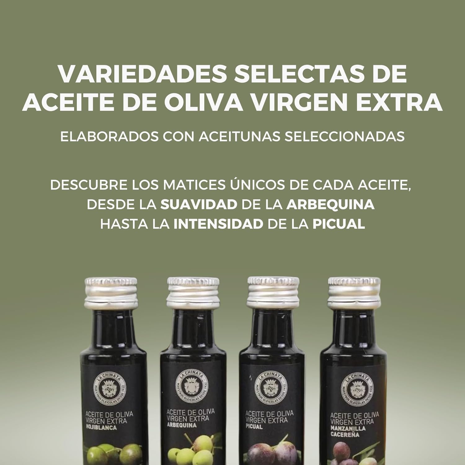 Extra Virgin Olive Oil Tasting Case: Includes four varieties in bottles of 25 ml each, perfect to experiment with different gourmet flavors such as Hojiblanca , Arbequina , Picual and Chamomile. Gourmet pack ideal for gift: This set of Extra Virgin Olive Oil in an elegant case is perfect for tastings and as a gift for lovers of gastronomy who are looking for high quality products. Selected varieties of Extra Virgin Olive Oil: Discover the unique nuances of each oil, from the softness of the Arbequina to the intensity of the Picual, made with selected olives. EXCLUSIVE TASTING OF EXTRA VIRGIN OLIVE OIL: Each 25 ml bottle offers an authentic flavor, ideal for enhancing dishes such as salads, meats or seafood with a gourmet touch. High quality artisanal product: This Extra Virgin Olive Oil tasting case is made with natural ingredients, guaranteeing the purity and freshness of each variety, perfect to surprise on any occasion. βΊ See more product details,Extra Virgin Olive Oil Tasting Case: Includes four varieties in bottles of 25 ml each, perfect to experiment with different gourmet flavors such as Hojiblanca , Arbequina , Picual and Chamomile,Gourmet pack ideal for gift: This set of Extra Virgin Olive Oil in an elegant case is perfect for tastings and as a gift for lovers of gastronomy who are looking for high quality products,Selected varieties of Extra Virgin Olive Oil: Discover the unique nuances of each oil, from the softness of the Arbequina to the intensity of the Picual, made with selected olives,EXCLUSIVE TASTING OF EXTRA VIRGIN OLIVE OIL: Each 25 ml bottle offers an authentic flavor, ideal for enhancing dishes such as salads, meats or seafood with a gourmet touch,High quality artisanal product: This Extra Virgin Olive Oil tasting case is made with natural ingredients, guaranteeing the purity and freshness of each variety, perfect to surprise on any occasion