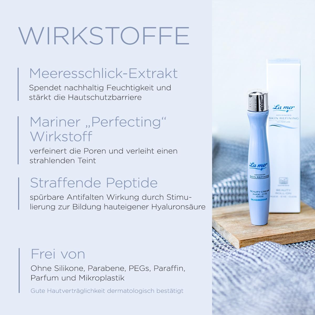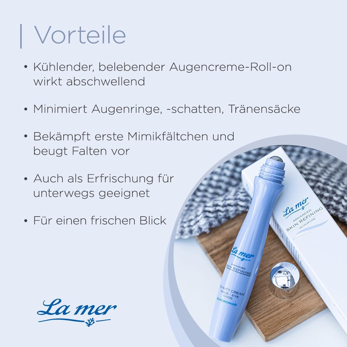 About this item Effective skin care: The Advanced Skin Refining Eye Roll-On from La mer offers effective and targeted skin care for the sensitive eye area. Its exclusive formula supports skin regeneration and helps reduce fine lines and wrinkles. Refreshing use: the roll-on applicator allows for a pleasant and refreshing application. The cooling metal ball design helps reduce puffiness and dark circles while the formula is gently incorporated into the skin to give a radiant appearance. High-quality ingredients: La mer stands for high-quality and effective skin care products. The Advanced Skin Refining Eye Roll-On contains carefully selected ingredients such as sea minerals and algae extracts, known to revitalize and provide essential nutrients to the skin. All-in-one solution: this eye roll-on offers an all-in-one solution for different skin needs. In addition to wrinkle reduction and skin regeneration, it also helps reduce dark circles and improve skin elasticity. It is therefore a versatile addition to the daily skincare routine. Clean beauty: our ingredients are particularly suitable for allergy sufferers. We do not use paraffins, silicones, parabens, PEGs, dyes and ingredients of animal origin. Made in Germany › See more product details,Effective skin care: The Advanced Skin Refining Eye Roll-On from La mer offers effective and targeted skin care for the sensitive eye area. Its exclusive formula supports skin regeneration and helps reduce fine lines and wrinkles,Refreshing use: the roll-on applicator allows for a pleasant and refreshing application. The cooling metal ball design helps reduce puffiness and dark circles while the formula is gently incorporated into the skin to give a radiant appearance,High-quality ingredients: La mer stands for high-quality and effective skin care products. The Advanced Skin Refining Eye Roll-On contains carefully selected ingredients such as sea minerals and algae extracts, known to revitalize and provide essential nutrients to the skin,All-in-one solution: this eye roll-on offers an all-in-one solution for different skin needs. In addition to wrinkle reduction and skin regeneration, it also helps reduce dark circles and improve skin elasticity. It is therefore a versatile addition to the daily skincare routine,Clean beauty: our ingredients are particularly suitable for allergy sufferers. We do not use paraffins, silicones, parabens, PEGs, dyes and ingredients of animal origin. Made in Germany