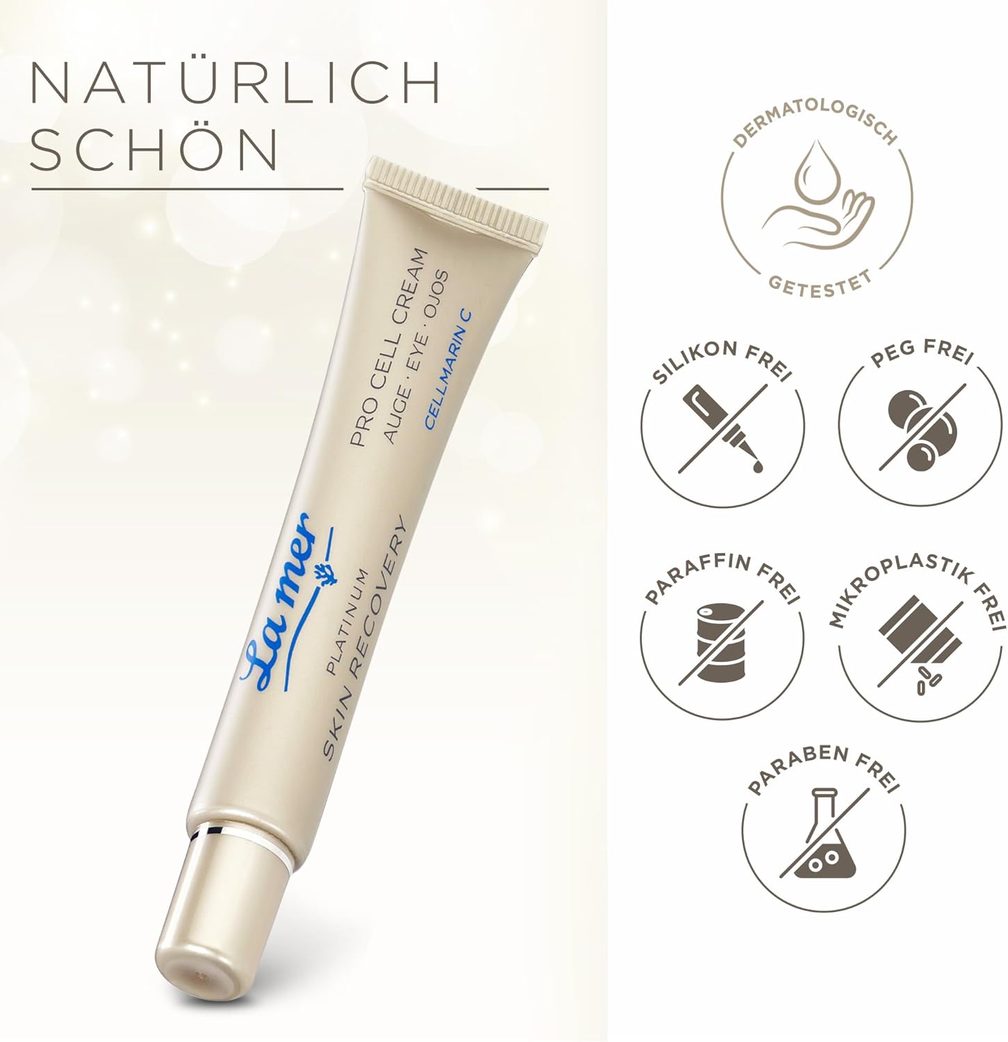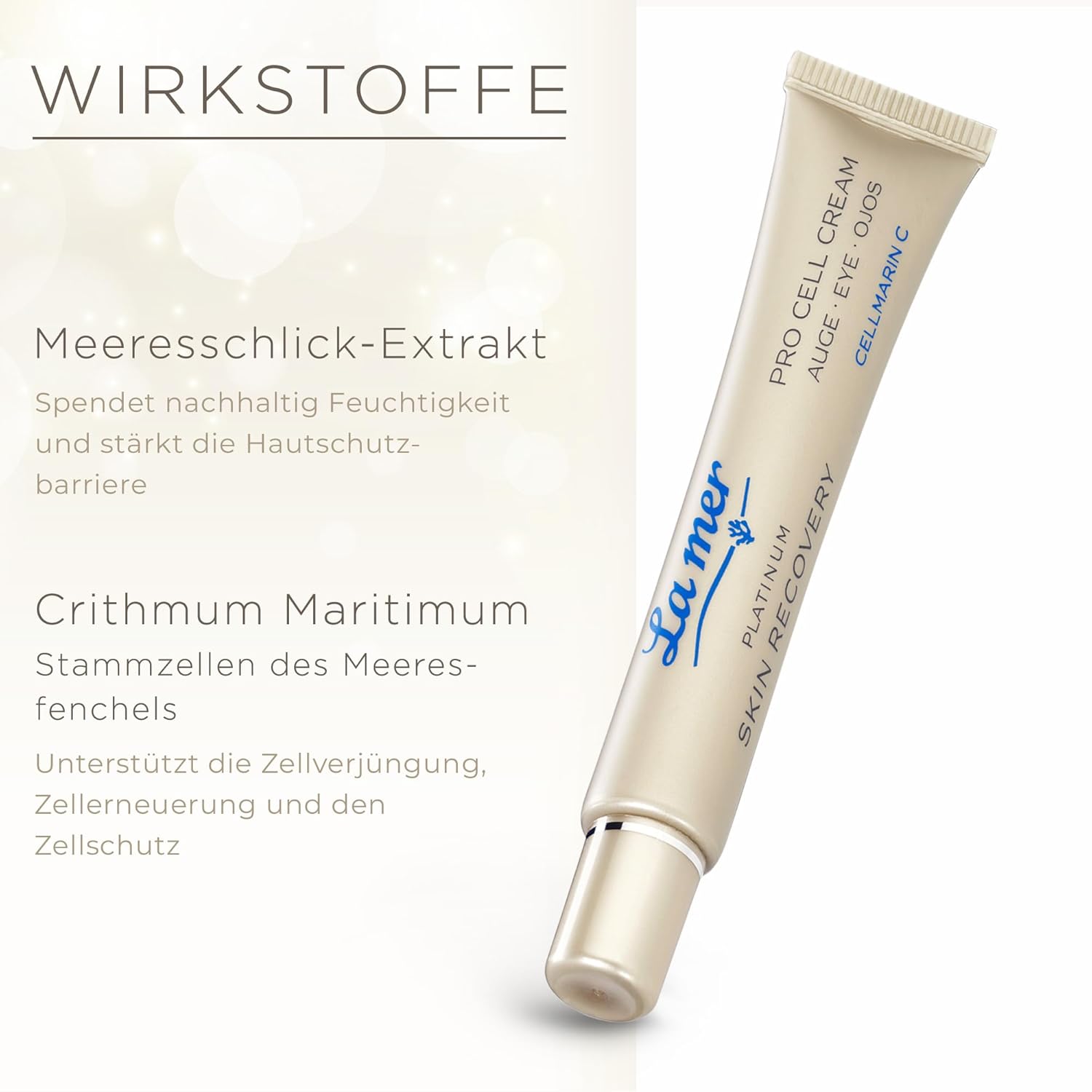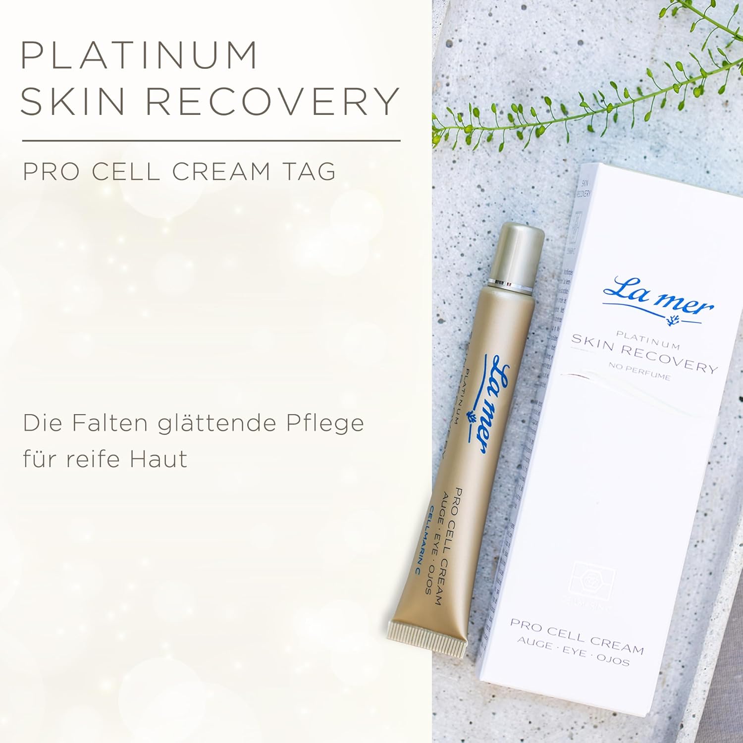 Product description International products have separate terms, are sold from abroad and may differ from local products, including fit, age ratings, and language of product, labeling or instructions. Ingredients Aqua (Water), Simmondsia Chinensis (Jojoba) seed oil, glycerine, pentylene glycol, propanediol, isostearyl alcohol, butylene glycol coating, undecane, pullan, sodium acrylates/C10-30 AL. KYL ACRYL ATES CROSSPOLYMER, TRIDECANE, MARIS AQUA (SEA WATER), MARIS LIMUS (SEA SILT) EXTRACT, CAPRYLYL GLYCOL, EVODIA RUTAECARPA FRUIT EXTRACT, XANTHAN GUM, P-ANISIC ACID, NANNOCHLOROPSIS OCULATA EXTRACT, CRIT. MARITIMIMMOMOM UM CALLUS CULTURE FILTRATE, ETHYLCELLULOSE, LAMINARIA DIGITATA EXTRACT, PHENETHYL ALCOHOL, PLANKTON EXTRACT, UNDARIA PINNATIFIDA EXTRACT, PHORMIDIUM PERSICINUM EXTRACT, CITRIC ACID, TOCOPHEROL, HELIANTHER US US ANNUUS (S Unflower) seed oil,CELL ACTIVATING EYE CREAM The Platinum Skin Recovery Pro Cell Cream Eye is an intense eye cream specially formulated to activate skin cells and promote their natural regeneration,Anti-ageing effect: the eye cream is ideal for delaying skin ageing. It promotes cell renewal, activates collagen synthesis and protects cellular DNA to reduce fine lines and wrinkles and improve skin elasticity,REDUCTION OF EYE RINGS AND SWELLING: Eye care works on the micro-circulation of the skin, improving blood circulation. This helps reduce dark circles and puffiness, and promote a fresher, more youthful appearance of the eye area,Light texture: the cream has a light texture that is quickly absorbed by the skin. This makes it easy to apply and leaves no greasy residue,Convincing ingredients: We believe in Clean Beauty - our ingredients are particularly suitable for allergy sufferers. We do not use paraffins, silicones, parabens, PEGs, dyes and ingredients of animal origin. Made in Germany