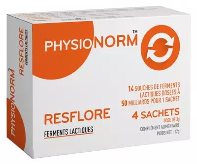 Laboratoire Immubio Physionorm Resflore Lactic Ferments 4 Sachets Is A Food Supplement Based On 14 Strains Of Lactic Ferments Dosed At 50 Billion For 1 Sachet. It Also Contains Short Chain Fructooligosaccharides