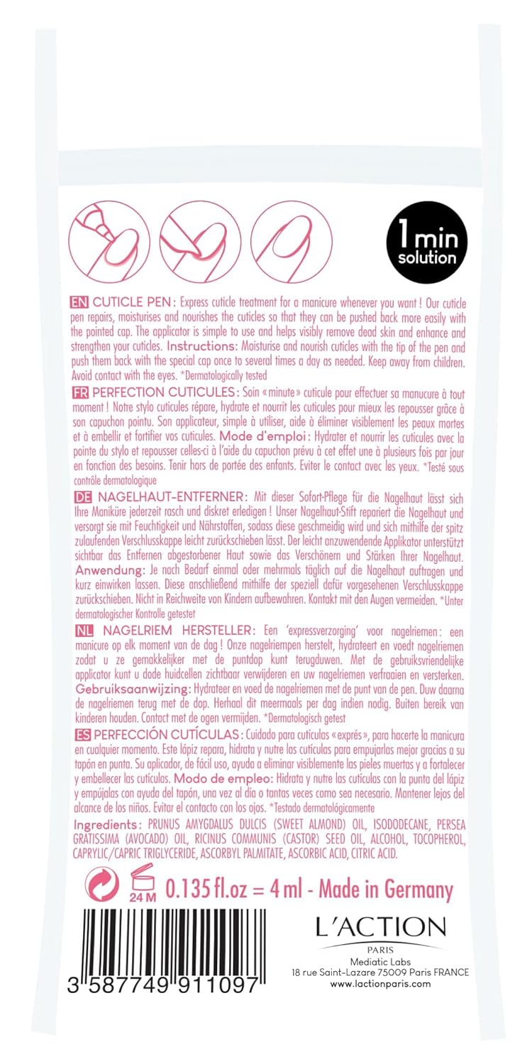 About this item LâAction Paris offers three moments to take care of yourself : ONE MINUTE SOLUTION, SPA TIME, and OVERNIGHT SOLUTIONS. Our customers are invited to have an active attitude during those three moments. They will also customize the products to their own needs. âBEAUTY IS NOW !â Our products have already proved their worth over the past ten years in around 30 countries around the world. In addition to French manufacturing quality, LâAction Paris has focused on a light, modern and playful packaging that offers products that act on the targeted areas of your face in a specific and localized way. All our products are dermatologically tested . Express cuticle treatment for a manicure whenever you want! Our cuticle pen repairs, moisturises and nourishes the cuticles so that they can be pushed back more easily with the pointed cap. The applicator is simple to use and helps visibly remove dead skin and enhance and strengthen your cuticles. Avocado oil : anti-aging et nourishing Sweet almond oil : repairing and strengthening âș See more product details,LâAction Paris offers three moments to take care of yourself : ONE MINUTE SOLUTION, SPA TIME, and OVERNIGHT SOLUTIONS. Our customers are invited to have an active attitude during those three moments. They will also customize the products to their own needs. âBEAUTY IS NOW !â,Our products have already proved their worth over the past ten years in around 30 countries around the world. In addition to French manufacturing quality, LâAction Paris has focused on a light, modern and playful packaging that offers products that act on the targeted areas of your face in a specific and localized way. All our products are dermatologically tested,Express cuticle treatment for a manicure whenever you want! Our cuticle pen repairs, moisturises and nourishes the cuticles so that they can be pushed back more easily with the pointed cap,The applicator is simple to use and helps visibly remove dead skin and enhance and strengthen your cuticles,Avocado oil : anti-aging et nourishing Sweet almond oil : repairing and strengthening