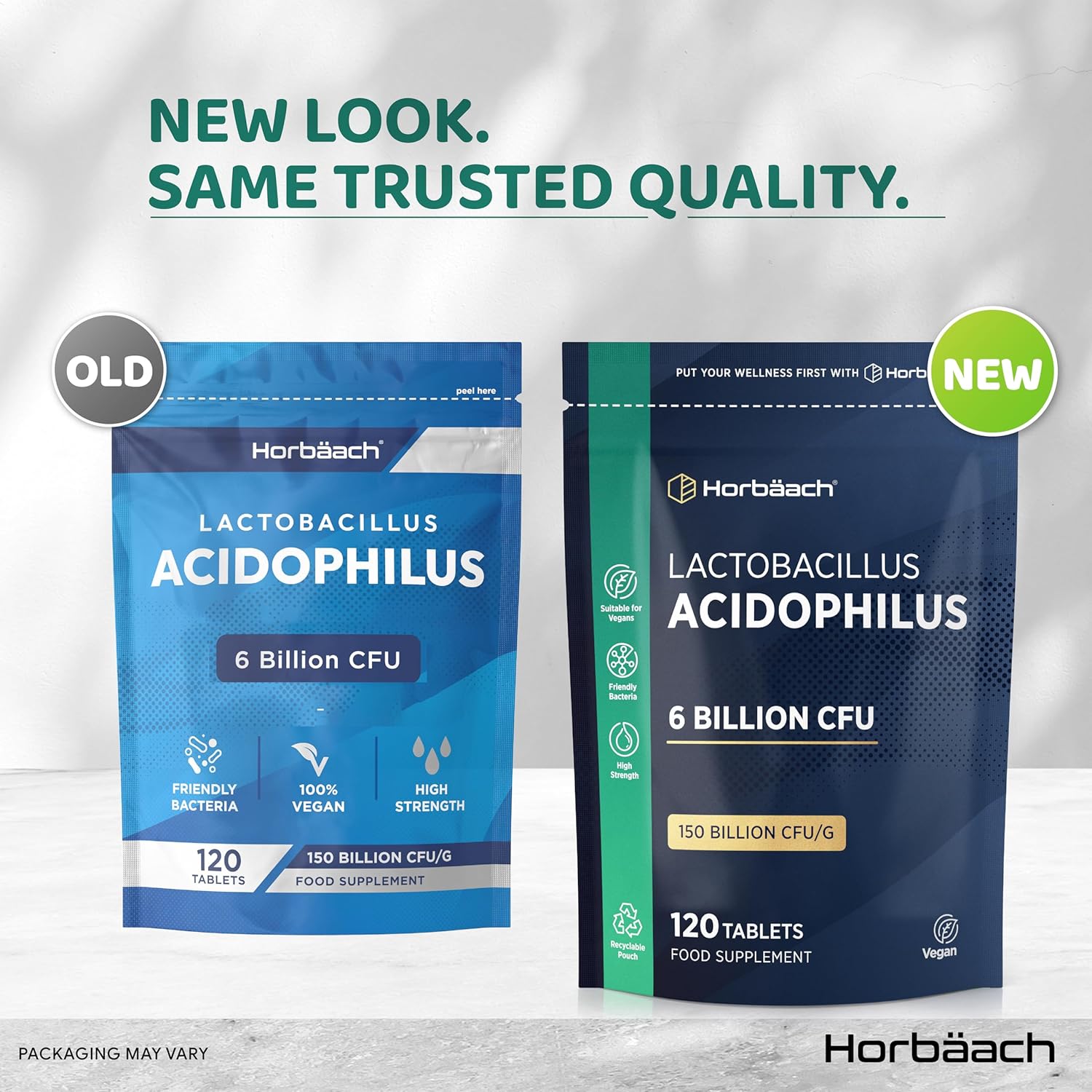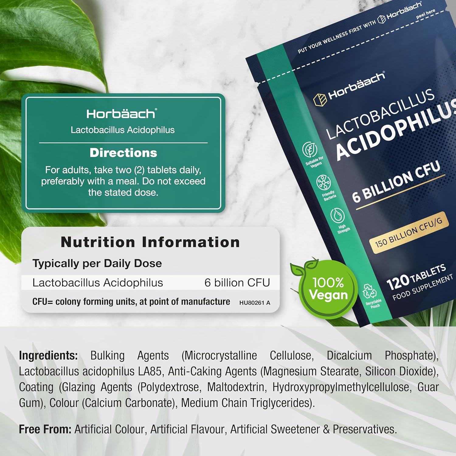 About this item 6 BILLION CFU SUPPLEMENT: Delivers a high strength 6 Billion CFU of acidophilus biotic per daily serving of 2 tablets. BIO CULTURES: Lactobacillus acidophilus is a friendly bacteria found in your intestines that helps protect against various health issues. CONVENIENT: Add to your diet by simply taking two of our oral tablets daily. No need to re-order every month as our 120-count pouch will provide you with digestive support for 2 months! SUITABLE FOR: Horbaach Acidophilus tablets are suitable for vegetarians and vegans and contain no artificial colours, flavours, or preservatives. It's the perfect formula for adult men and women at the best value. PACKAGING MAY VARY: We are in the process of updating our packaging. If the product you receive appears different, please rest assured that the benefits remain the same. āŗ See more product details,6 BILLION CFU SUPPLEMENT: Delivers a high strength 6 Billion CFU of acidophilus biotic per daily serving of 2 tablets,BIO CULTURES: Lactobacillus acidophilus is a friendly bacteria found in your intestines that helps protect against various health issues,CONVENIENT: Add to your diet by simply taking two of our oral tablets daily. No need to re-order every month as our 120-count pouch will provide you with digestive support for 2 months!,SUITABLE FOR: Horbaach Acidophilus tablets are suitable for vegetarians and vegans and contain no artificial colours, flavours, or preservatives. It's the perfect formula for adult men and women at the best value,PACKAGING MAY VARY: We are in the process of updating our packaging. If the product you receive appears different, please rest assured that the benefits remain the same