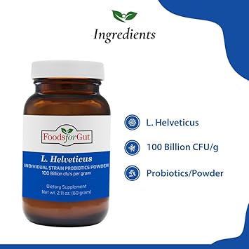 About this item Ingredients: Lactobacillus Helveticus (L. Helveticus). No other ingredients or additives. Our probiotic powders are stored in our FDA-registered facility, ensuring strict control over product quality at every stage. We manage the entire process in-house, without relying on third-party warehouses. All products are sent directly from our facility, allowing us to oversee every detail and ensure prompt, reliable process to your doorstep. This hands-on approach reflects Foods For Gut's commitment to excellence and customer satisfaction. Natural Defense System: Our probiotic powder supports the body's natural defense system by facilitating a healthy gut microbiome, which plays a key role in immune function. Simply mix it with water, smoothies, or any preferred method. Regular use of our probiotic supports balanced digestion, boosts immunity, and can alleviate digestive discomfort. Ideal for those looking for an easy, effective way to improve their overall well-being and maintain a healthy gut. Quality & PURITY: This probiotic powder classifies purity by using high-quality ingredients and avoiding unnecessary additives. This single strain probiotic powder does not contain any dairy, sugar, gluten, soy, casein, yeast, artificial colors, flavors, preservatives, FOS or any GMO. By focusing purely on essential components and eliminating unnecessary excipients, this probiotic ensures maximum efficiency and a premium quality product that supports health and promotes overall wellness. Perfect for Any Lifestyle: Foods For Gut offers premium individual strains and exclusive multi-strain probiotic formulas that are professionally formulated and MADE IN THE USA. Each superior strain provides a range of benefits to maximize your needs and provide a stronger immune system. Adding probiotic supplements to your daily routine can support balanced digestion, boosts immunity, and can alleviate digestive discomfort. Ideal for those looking for an easy, effective way to improve their overall well-being and maintain a healthy gut. See more product details, Ingredients: Lactobacillus Helveticus (L. Helveticus). No other ingredients or additives, Our probiotic powders are stored in our FDA-registered facility, ensuring strict control over product quality at every stage. We manage the entire process in-house, without relying on third-party warehouses. All products are sent directly from our facility, allowing us to oversee every detail and ensure prompt, reliable process to your doorstep. This hands-on approach reflects Foods For Gut's commitment to excellence and customer satisfaction, Natural Defense System: Our probiotic powder supports the body's natural defense system by facilitating a healthy gut microbiome, which plays a key role in immune function. Simply mix it with water, smoothies, or any preferred method. Regular use of our probiotic supports balanced digestion, boosts immunity, and can alleviate digestive discomfort. Ideal for those looking for an easy, effective way to improve their overall well-being and maintain a healthy gut, Quality & PURITY: This probiotic powder classifies purity by using high-quality ingredients and avoiding unnecessary additives. This single strain probiotic powder does not contain any dairy, sugar, gluten, soy, casein, yeast, artificial colors, flavors, preservatives, FOS or any GMO. By focusing purely on essential components and eliminating unnecessary excipients, this probiotic ensures maximum efficiency and a premium quality product that supports health and promotes overall wellness, Perfect for Any Lifestyle: Foods For Gut offers premium individual strains and exclusive multi-strain probiotic formulas that are professionally formulated and MADE IN THE USA. Each superior strain provides a range of benefits to maximize your needs and provide a stronger immune system. Adding probiotic supplements to your daily routine can support balanced digestion, boosts immunity, and can alleviate digestive discomfort. Ideal for those looking for an easy, effective way to improve their overall well-being and maintain a healthy gut