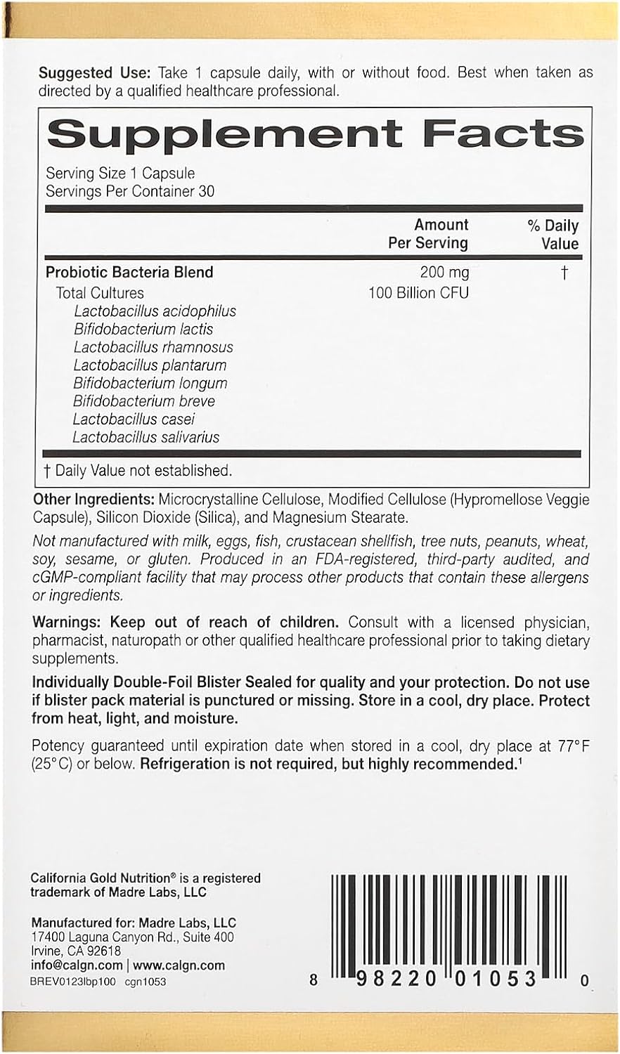 DESCRIPTION : LactoBif Probiotics, 100 Bllion CFU, 8 Active & Clinically Researched Probiotic Strains, Soy-Free, Sugar-Free, Vegetarian, Individually Double-foil Blister Sealed, 30 Veggie Capsules