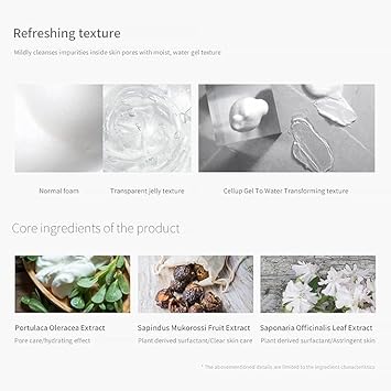 About this item PH-BALANCED MORNING CLEANSER: Removes excess sebum, skincare residues, and impurities while preserving natural moisture. CLEANSING & HYDRATING: With 85% skincare base and plant surfactants, it purifies while keeping skin plump. Gentle massage boosts circulation. SMOOTH NO-FOAM GEL: Glides gently for a refreshing cleanse, also removes light makeup in the evening. PORE CARE & OIL CONTROL: Portulaca Oleracea Extract (rich in omega-3) soothes, minimizes pores, and balances oil-moisture levels. HOW TO USE: Massage a suitable amount onto dry or wet face to remove excess sebum and impurities, then rinse with lukewarm water. › See more product details,PH-BALANCED MORNING CLEANSER: Removes excess sebum, skincare residues, and impurities while preserving natural moisture,CLEANSING & HYDRATING: With 85% skincare base and plant surfactants, it purifies while keeping skin plump. Gentle massage boosts circulation,SMOOTH NO-FOAM GEL: Glides gently for a refreshing cleanse, also removes light makeup in the evening,PORE CARE & OIL CONTROL: Portulaca Oleracea Extract (rich in omega-3) soothes, minimizes pores, and balances oil-moisture levels,HOW TO USE: Massage a suitable amount onto dry or wet face to remove excess sebum and impurities, then rinse with lukewarm water