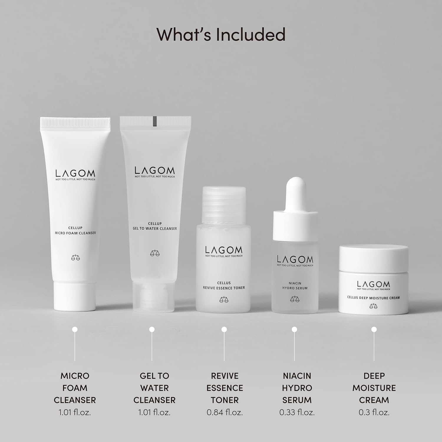 Lagom Mini 5-Step Travel Kit | Daily Cleansing Skincare Kit, Gel To Water, Micro Foam Cleanser, Niacin Serum, Deep Moisture Cream, Korean Skin Care Trial Kit