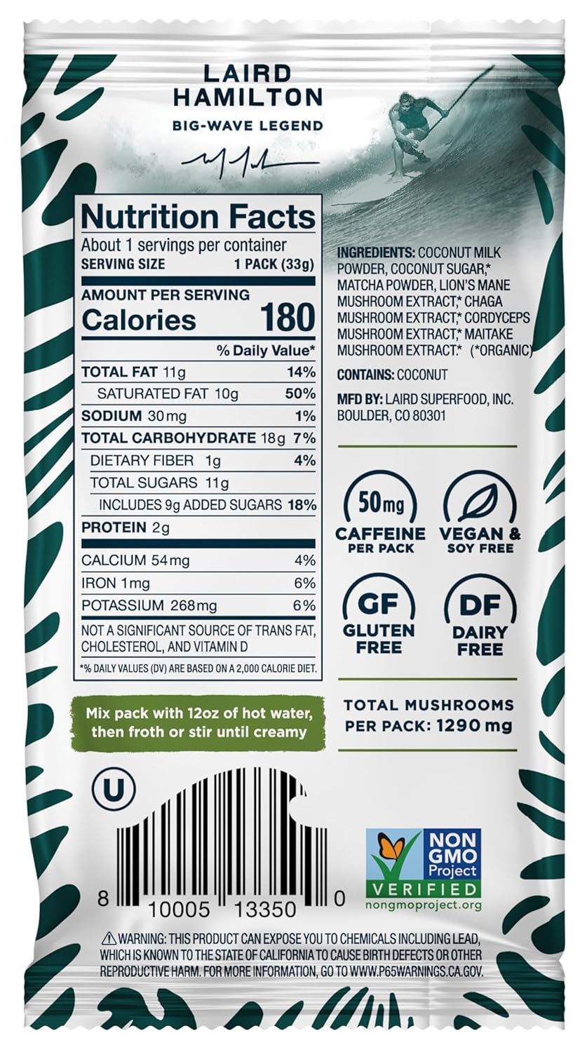 About this item Imagine, a perfect blend of Japanese matcha and our Sweet & Creamy Superfood Coconut Creamer. And now we’ve added our favorite functional mushroom extracts to bring even more benefit to your match experience. Ready for a superfood matcha latte whenever and wherever you want it You no longer need a coffee shop (or tons of time) to get a boost of delicious, functional fuel. Laird adds adaptogens and functional mushrooms to his diet to help him stay balanced in moments of stress. Add 1/4 cup of Instant Latte to your cup. (Trust us, add the powder first!), Add 12 ounces of hot water, Froth & Enjoy! Now available in single serve sachets so you can enjoy your favorite latte anywhere, anytime! › See more product details,Imagine, a perfect blend of Japanese matcha and our Sweet & Creamy Superfood Coconut Creamer. And now we’ve added our favorite functional mushroom extracts to bring even more benefit to your match experience,Ready for a superfood matcha latte whenever and wherever you want it You no longer need a coffee shop (or tons of time) to get a boost of delicious, functional fuel,Laird adds adaptogens and functional mushrooms to his diet to help him stay balanced in moments of stress,Add 1/4 cup of Instant Latte to your cup. (Trust us, add the powder first!), Add 12 ounces of hot water, Froth & Enjoy!,Now available in single serve sachets so you can enjoy your favorite latte anywhere, anytime!