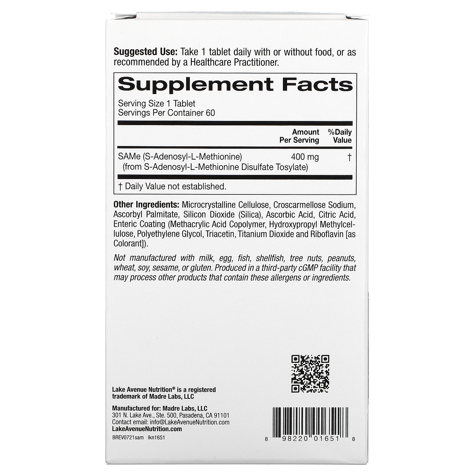 Lake Avenue Nutrition, Same (S-Adenosyl-L-Methionine Disulfate Tosylate), 400 Mg