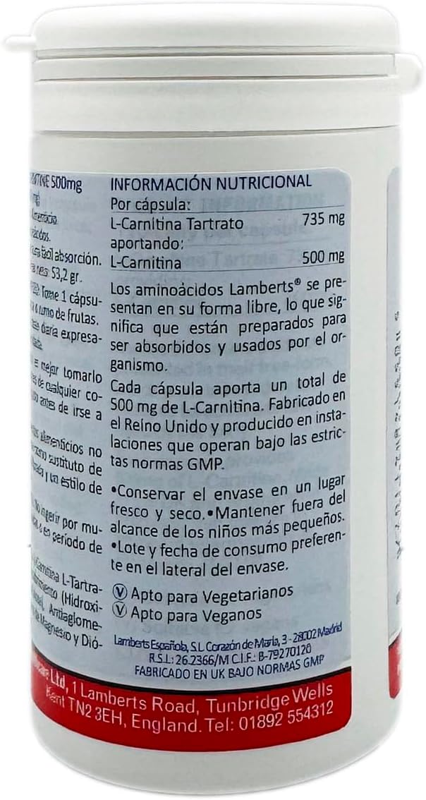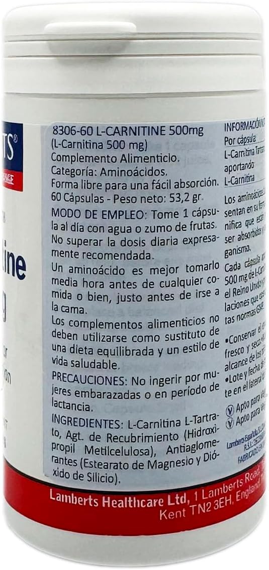 Lamberts L-Carnitine 500Mg 60 Capsules – Pure Free-Form Carnitine – As L-Carnitine L-Tartrate – Vegan