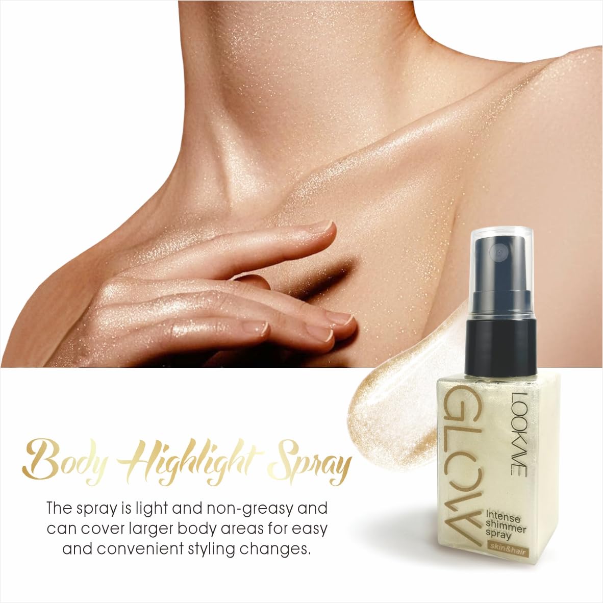 Multi functions: The highlighter setting spray not only can be used for face, but also used for body and hair. The area you apply will turn shiny and metallic