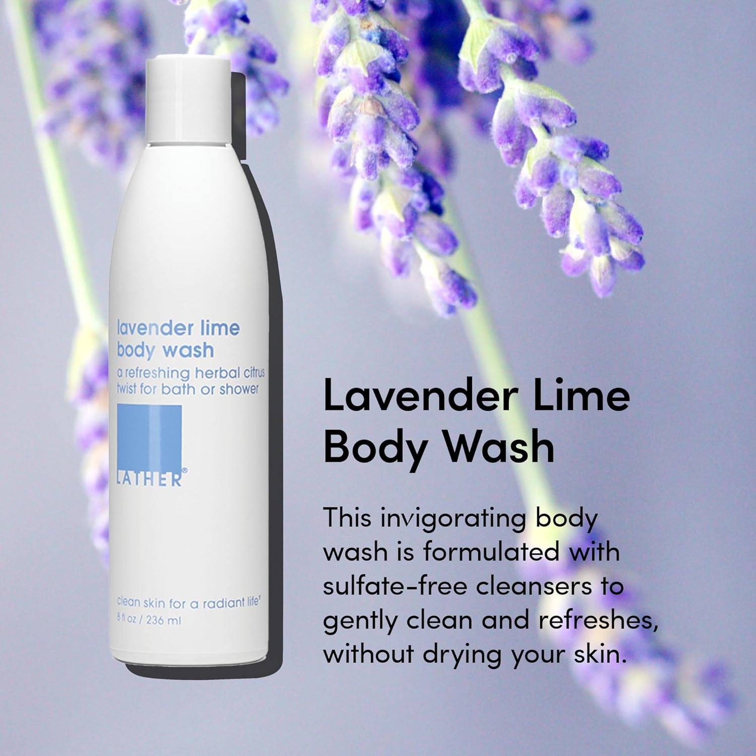 About this item Lavender Lime Body Wash - Formulated with gentle cleansers and botanical extracts to moisturize and nourish the skin, this luxurious foaming shower gel features good-for-you ingredients, including chamomile, ginseng, rosemary, and lemongrass. Why We Love It - The lavender and lime pure essential oils uplift and revitalize your senses. No parabens, sulfates, mineral oil, synthetic fragrances, or colors. Vegan. Never tested on animals. Rejuvenating Body Cleanser - Create a spa-worthy shower experience with our combination of lavender and lime in an 8 fl oz bottle. Also available in Bamboo Lemongrass, Bamboo Crème, or Coconut Crème varieties. How To Use - Apply to wet skin with hands or sponge and work up lather. Rinse with warm water. Safe for all skin types. Pairs perfectly with our Natural Sea Sponge, Moisturizer, and Body Scrub. Why LATHER - We first began with a line of naturally fragranced olive oil soaps. 25 years later, we now offer a collection of hair, face, body, and wellness products found in boutiques, hotels, spas, and resorts worldwide. › See more product details,Lavender Lime Body Wash - Formulated with gentle cleansers and botanical extracts to moisturize and nourish the skin, this luxurious foaming shower gel features good-for-you ingredients, including chamomile, ginseng, rosemary, and lemongrass,Why We Love It - The lavender and lime pure essential oils uplift and revitalize your senses. No parabens, sulfates, mineral oil, synthetic fragrances, or colors. Vegan. Never tested on animals,Rejuvenating Body Cleanser - Create a spa-worthy shower experience with our combination of lavender and lime in an 8 fl oz bottle. Also available in Bamboo Lemongrass, Bamboo Crème, or Coconut Crème varieties,How To Use - Apply to wet skin with hands or sponge and work up lather. Rinse with warm water. Safe for all skin types. Pairs perfectly with our Natural Sea Sponge, Moisturizer, and Body Scrub,Why LATHER - We first began with a line of naturally fragranced olive oil soaps. 25 years later, we now offer a collection of hair, face, body, and wellness products found in boutiques, hotels, spas, and resorts worldwide