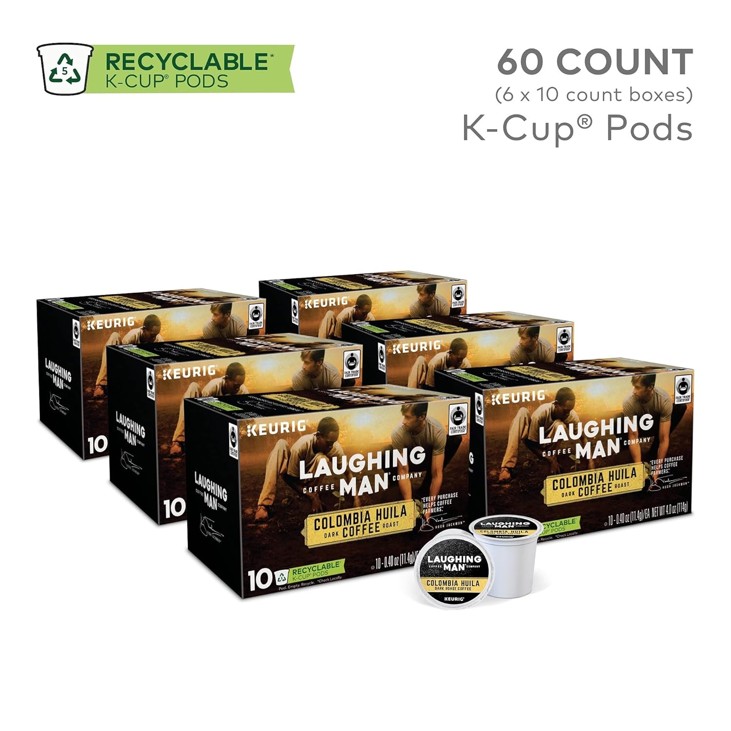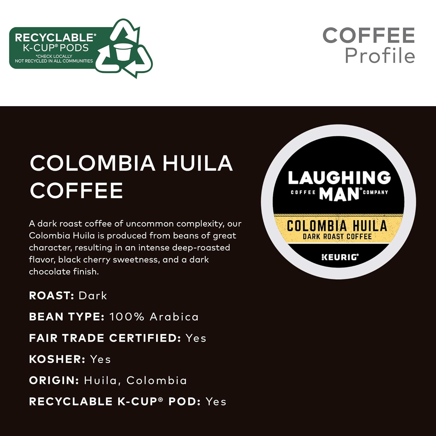 Every Purchase Helps Coffee Farmers. A Dark Roast Coffee Of Uncommon Complexity, Our Laughing Man Colombia Huila Is Produced From Beans Of Great Character, Resulting In An Intense Deep-Roasted Flavor, Black Cherry Sweetness, And A Dark Chocolate Finish. These Single-Serve K-Cup Pods Are Compatible With All Keurig K-Cup Pod Single-Serve Coffee Makers. Each K-Cup Pod Is Filled With The Freshest Ground Coffee And Brews A Perfect, Great Tasting Cup Of Coffee, Every Time. 100% Arabica, Fair Trade And Certified Orthodox Union Kosher Coffee. Laughing Man Coffee Is Now Available In A Recyclable K-Cup Pod. Features Dark. Smoky. Sweet. Dark Roast, Caffeinated Coffee Fair Trade Certified Orthodox Union Kosher Single Origin: Huila, Colombia Made With Arabica Coffee Laughing Man Coffee Is Now Available In A Recyclable K-Cup Pod Compatible With Keurig K-Cup Pod Single-Serve Coffee Makers