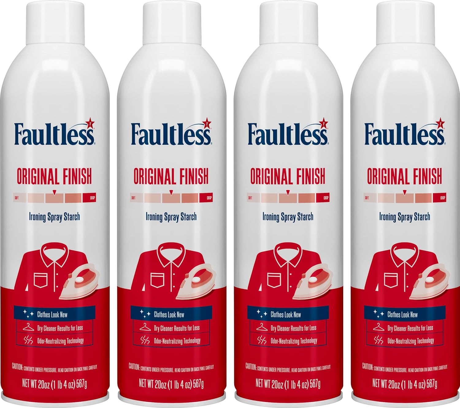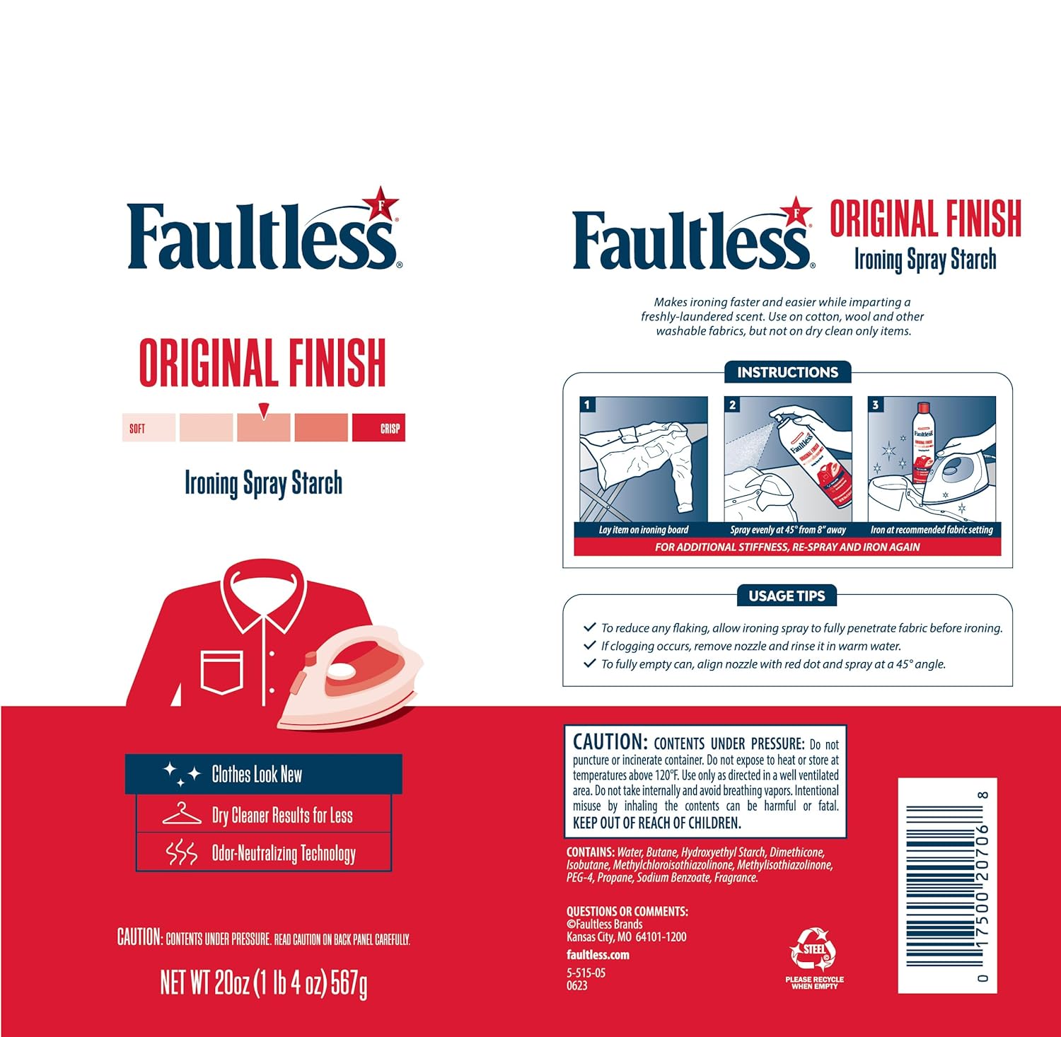 QUICK & EASY IRON AID: Let your clothes come out sharp, crisp and wrinkle-free with Faultlessā iron out spray. This spray starch is the original hold formula, which is light yet effective. This iron spray for clothes contains an iron aid, making it easier and faster for irons to glide on fabrics10IRON STARCH SPRAY FOR CLOTHES: This ironing spray leaves no residue behind. This easy to use laundry spray relaxes stubborn wrinkles, giving your clothing a crisp and pressed finish. Make clothes look and feel like brand new with this aerosol starch spray10CRISP ORIGINAL HOLD: Get the same quality from professional laundering at a fraction of the cost with this clothes spray. Enriched with Fibrefresher technology, which helps to eliminate odors and keeps clothes smelling fresh longer10BUY IN BULK: Our Faultless Original Hold ironing spray is designed for the lone bachelor, and large families in mind. We offer varying size packs at a great value, so you save money and have a long-lasting supply. Stock up on your laundry cleaning supplies10TRUSTED SINCE 1887: Our laundry products are tested in a lab before they ever reach your home. Faultless ironing sprays are proven to be effective, but we never stop improving. Since 1887, Faultless has been by the ironing boardās side ā there to help make people feel good about how they dress