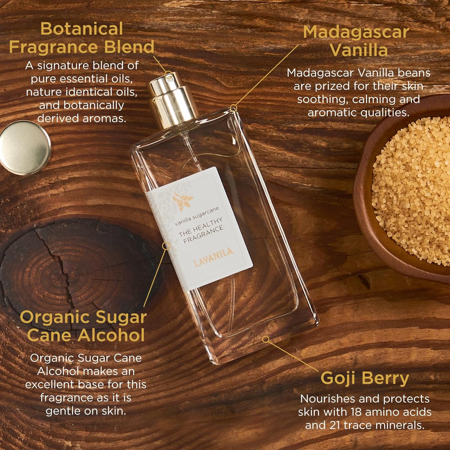 About this item VANILLA SUGAR CANE HEALTHY FRAGRANCE. Sweet and soft in essence, sugarcane blends with vanilla flower, bright mandarin and smooth Madagascar vanilla for a subtle aroma that’s warm and inviting. HOW TO USE. For a long-lasting scent, apply the natural vanilla perfume to clean dry skin. Pro tip: Layer a couple of The Healthy Fragrances to create a unique signature vanilla scent. HANDCRAFTED HEALTHY FRAGRANCE. Our collection of healthy fragrances is carefully crafted by natural perfumers who have mastered a formula using a unique blend of sugar cane alcohol and essential oils. VANILLA-INSPIRED. Vanilla is associated with warmth, softness and purity through its aromatic properties. To capture these qualities, we chose vanilla to inspire our mission. OUR STORY. Named after the finest vanilla in the world found in Madagascar, Lavanila began with founder Danielle who believed in creating beauty products that were cleaner, safer and smarter not only for her family, but also her community and beyond. › See more product details,VANILLA SUGAR CANE HEALTHY FRAGRANCE. Sweet and soft in essence, sugarcane blends with vanilla flower, bright mandarin and smooth Madagascar vanilla for a subtle aroma that’s warm and inviting,HOW TO USE. For a long-lasting scent, apply the natural vanilla perfume to clean dry skin. Pro tip: Layer a couple of The Healthy Fragrances to create a unique signature vanilla scent,HANDCRAFTED HEALTHY FRAGRANCE. Our collection of healthy fragrances is carefully crafted by natural perfumers who have mastered a formula using a unique blend of sugar cane alcohol and essential oils,VANILLA-INSPIRED. Vanilla is associated with warmth, softness and purity through its aromatic properties. To capture these qualities, we chose vanilla to inspire our mission,OUR STORY. Named after the finest vanilla in the world found in Madagascar, Lavanila began with founder Danielle who believed in creating beauty products that were cleaner, safer and smarter not only for her family, but also her community and beyond