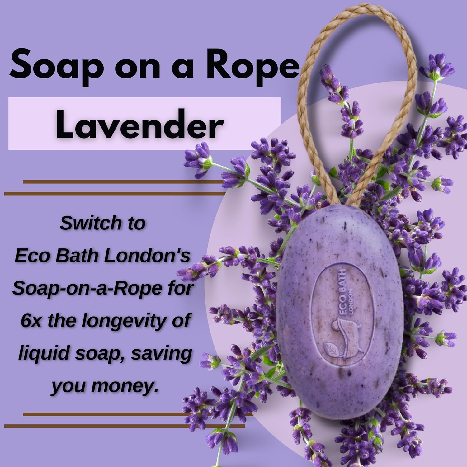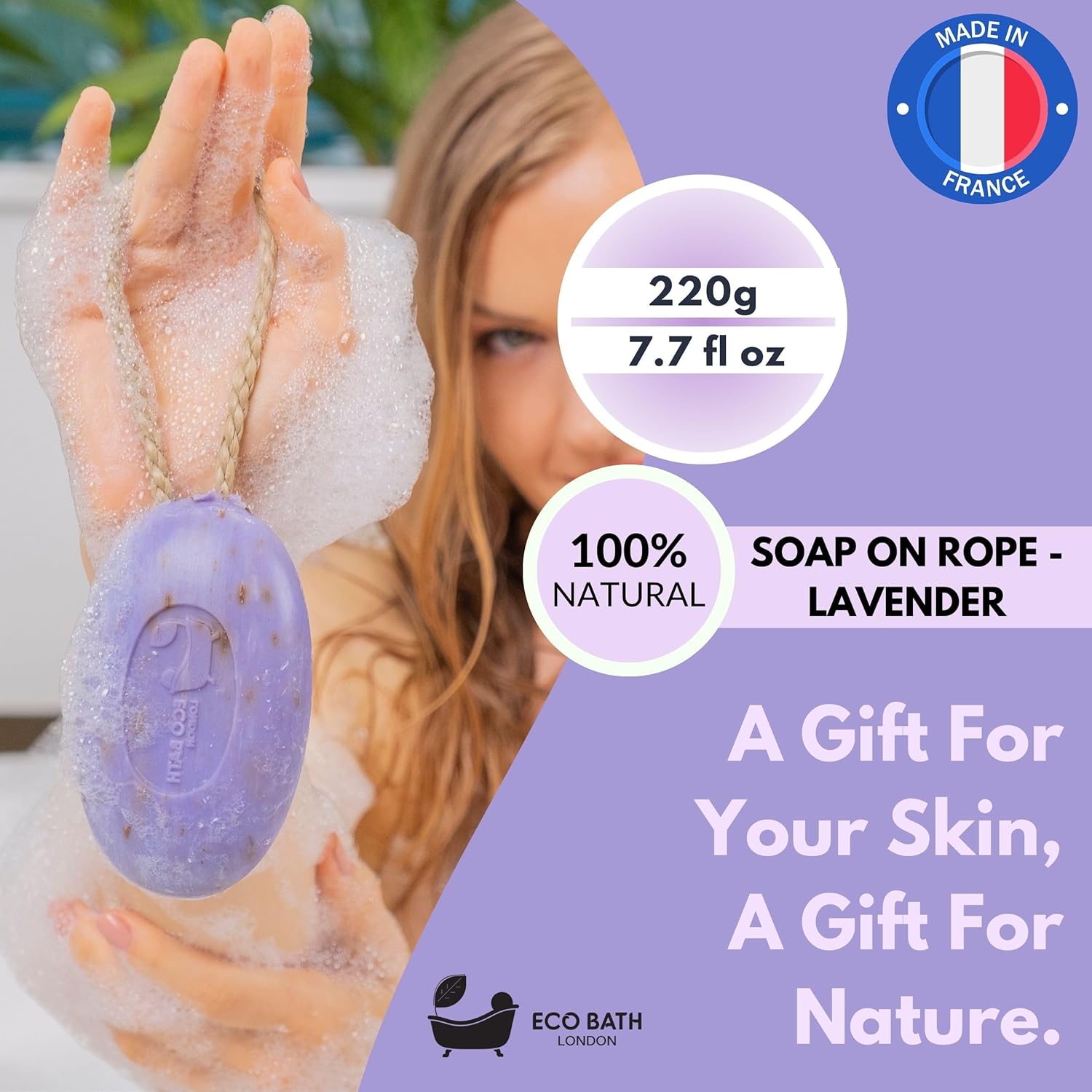 About this item CALMING LAVENDER SCENT: Infused with the soothing scent of lavender, the Eco Bath Soap on a Rope provides a calming and therapeutic shower experience. CONVENIENT ROPE HANDLE: The sturdy rope handle allows you to hang the soap bar to dry between uses, ensuring it stays fresh and lasts longer. NATURAL AND GENTLE: Made from high-quality natural ingredients, this soap bar is gentle on the skin, making it suitable for all skin types. ECO-FRIENDLY MATERIALS: Crafted from natural and biodegradable materials, this soap bar offers a safe and environmentally friendly way to care for your skin. PORTABLE AND CONVENIENT: Compact and lightweight, perfect for home use or travel, allowing you to maintain your skincare routine wherever you are. MOISTURISING SHEA BUTTER: Enriched with shea butter, this body wash bar hydrates and nourishes your skin, leaving it smooth, soft, and revitalised. See more product details, CALMING LAVENDER SCENT: Infused with the soothing scent of lavender, the Eco Bath Soap on a Rope provides a calming and therapeutic shower experience. , CONVENIENT ROPE HANDLE: The sturdy rope handle allows you to hang the soap bar to dry between uses, ensuring it stays fresh and lasts longer. , NATURAL AND GENTLE: Made from high-quality natural ingredients, this soap bar is gentle on the skin, making it suitable for all skin types. , ECO-FRIENDLY MATERIALS: Crafted from natural and biodegradable materials, this soap bar offers a safe and environmentally friendly way to care for your skin. , PORTABLE AND CONVENIENT: Compact and lightweight, perfect for home use or travel, allowing you to maintain your skincare routine wherever you are. , MOISTURISING SHEA BUTTER: Enriched with shea butter, this body wash bar hydrates and nourishes your skin, leaving it smooth, soft, and revitalised.