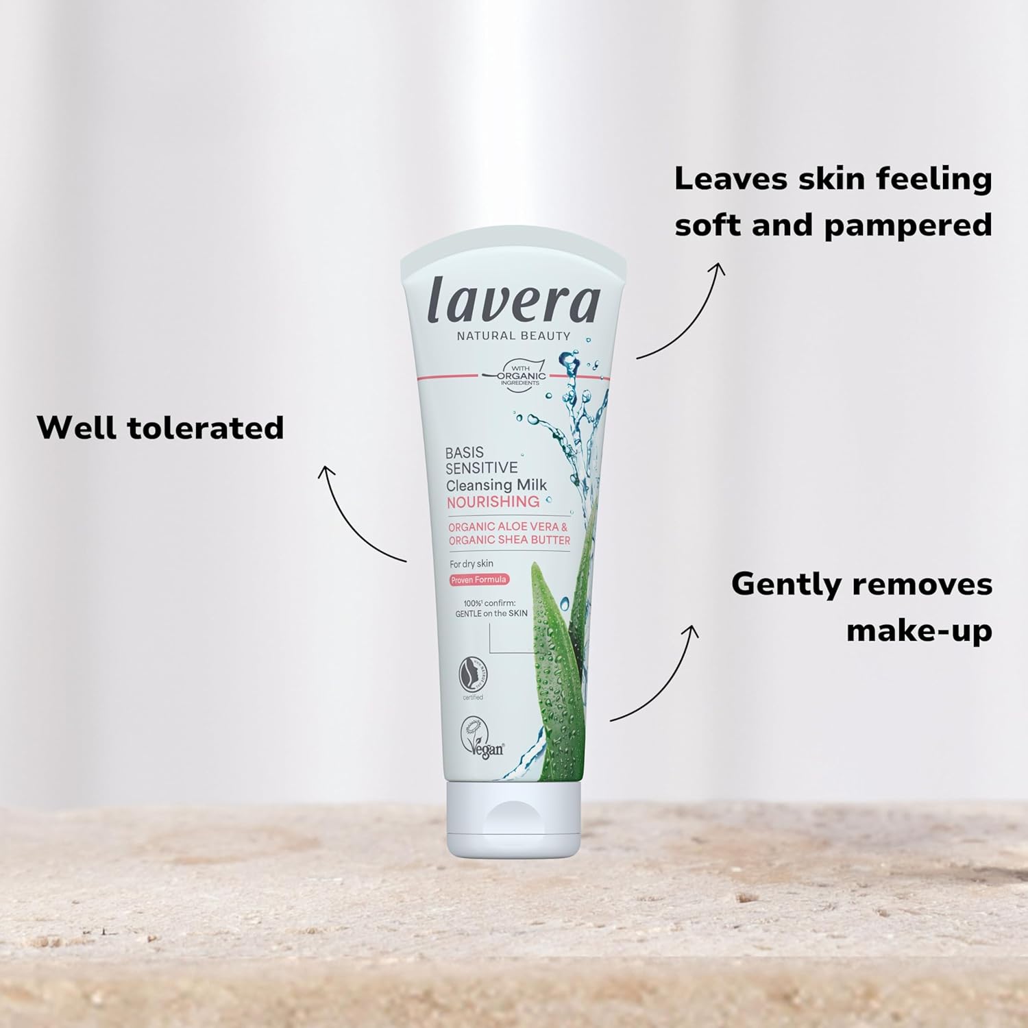 Lavera Basis Sensitive Cleansing Milk - Facial Cleanser With Aloe Vera & Shea Butter For Soft Skin - Make Up Remover - Face Wash - Peta Certified - Vegan - Made In Germany - 4.3 Fl Oz