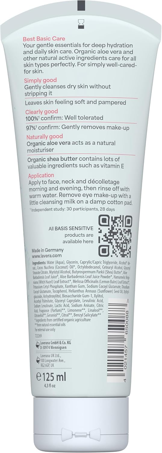 About this item GENTLE MAKE-UP REMOVAL: Effortlessly removes make-up and eye make-up while providing a soothing cleanse. Ideal for dry skin, our formula with organic aloe vera and shea butter ensures a gentle yet effective cleansing experience. NOURISHES & HYDRATES: Bio-Aloe Vera delivers intense hydration, while Bio-Shea Butter deeply nourishes, leaving skin feeling soft, smooth, and revitalized after each use - perfect for maintaining a radiant complexion. SUITABLE FOR FACE & EYES: Designed for use on the face, neck, and delicate eye area, this cleansing milk is the perfect all-in-one solution for a refreshed and clean feel without irritation. CERTIFIED NATURAL & ECO-FRIENDLY: Trust in the power of nature with our NATRUE-certified formula, free from synthetic fragrances and preservatives. Packaged in a tube made from 95% recycled materials, it's a choice that cares for your skin and the planet. MADE IN GERMANY: lavera is a family-owned company that stands for 100% certified natural cosmetics with high-quality organic plant-based ingredients from our own production. lavera cosmetics are developed, manufactured, and produced in Germany. › See more product details,GENTLE MAKE-UP REMOVAL: Effortlessly removes make-up and eye make-up while providing a soothing cleanse. Ideal for dry skin, our formula with organic aloe vera and shea butter ensures a gentle yet effective cleansing experience,NOURISHES & HYDRATES: Bio-Aloe Vera delivers intense hydration, while Bio-Shea Butter deeply nourishes, leaving skin feeling soft, smooth, and revitalized after each use - perfect for maintaining a radiant complexion,SUITABLE FOR FACE & EYES: Designed for use on the face, neck, and delicate eye area, this cleansing milk is the perfect all-in-one solution for a refreshed and clean feel without irritation,CERTIFIED NATURAL & ECO-FRIENDLY: Trust in the power of nature with our NATRUE-certified formula, free from synthetic fragrances and preservatives. Packaged in a tube made from 95% recycled materials, it's a choice that cares for your skin and the planet,MADE IN GERMANY: lavera is a family-owned company that stands for 100% certified natural cosmetics with high-quality organic plant-based ingredients from our own production. lavera cosmetics are developed, manufactured, and produced in Germany
