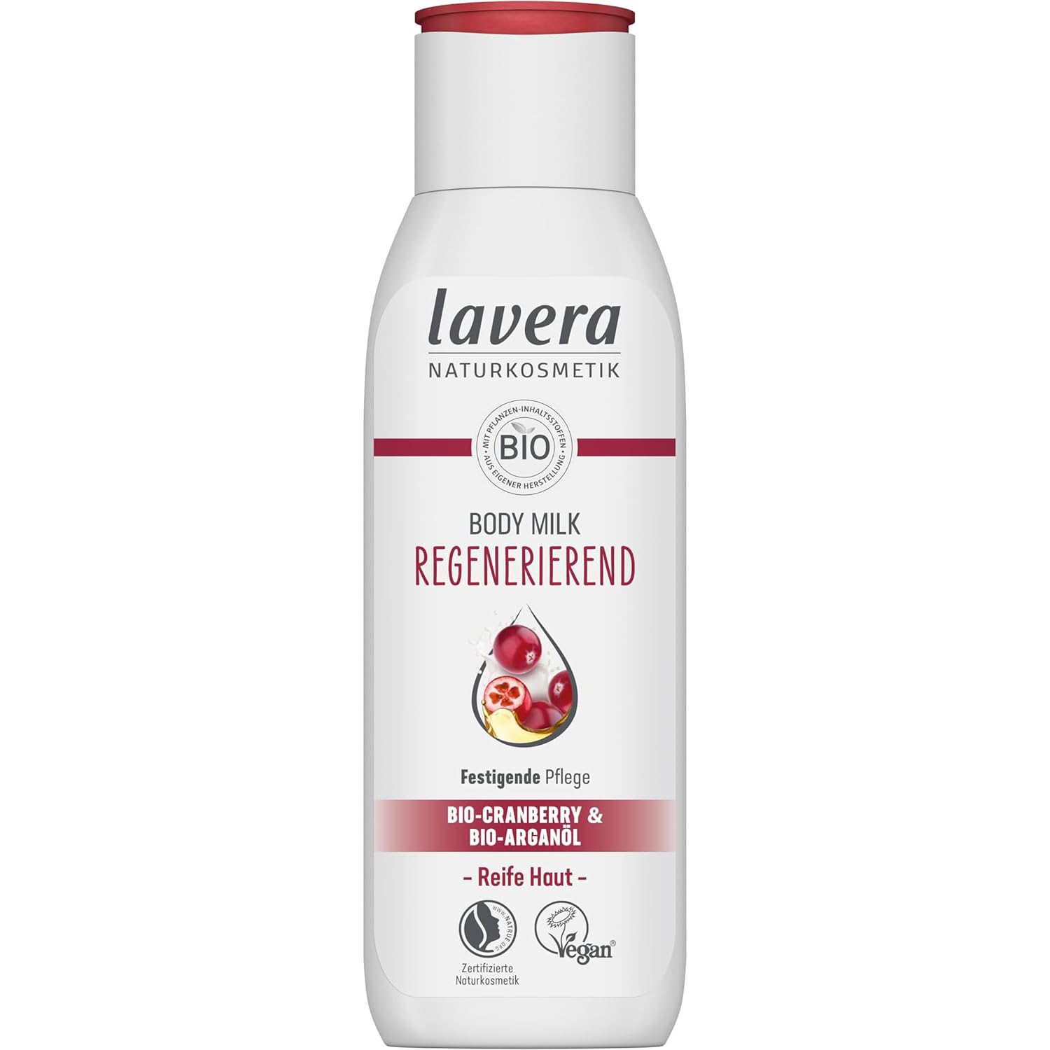 About this item REGENERATING BODY MILK FOR MATURE SKIN: Our lavera Body Milk Regenerating with organic cranberry and organic argan oil offers firming care for mature skin. The rich formula intensively moisturises the skin, supports natural regeneration and helps to firm the skin. It protects against dehydration and leaves the skin feeling smooth and supple INGREDIENTS: Organic cranberry extract is rich in antioxidants and supports skin regeneration, while organic argan oil intensively nourishes the skin and promotes its elasticity. This combination provides a firming effect and helps to combat the first signs of ageing, ideal for the care of mature skin. COMPATIBILITY: Certified according to the strict NATRUE natural cosmetics standard, dermatologically tested for compatibility, vegan, and PETA-certified for cruelty-free standards. WHY LAVERA: As a manufacturer of certified natural cosmetics, we do not use microplastics in any of our formulations. When extracting our raw materials, we pay attention to the highest (organic) quality and local origin. MADE IN GERMANY: Lavera is a family-owned company that stands for 100% certified natural cosmetics with high-quality organic plant-based ingredients from our own production. Lavera cosmetics are developed, manufactured, and produced in Germany. › See more product details,REGENERATING BODY MILK FOR MATURE SKIN: Our lavera Body Milk Regenerating with organic cranberry and organic argan oil offers firming care for mature skin. The rich formula intensively moisturises the skin, supports natural regeneration and helps to firm the skin. It protects against dehydration and leaves the skin feeling smooth and supple,INGREDIENTS: Organic cranberry extract is rich in antioxidants and supports skin regeneration, while organic argan oil intensively nourishes the skin and promotes its elasticity. This combination provides a firming effect and helps to combat the first signs of ageing, ideal for the care of mature skin,COMPATIBILITY: Certified according to the strict NATRUE natural cosmetics standard, dermatologically tested for compatibility, vegan, and PETA-certified for cruelty-free standards,WHY LAVERA: As a manufacturer of certified natural cosmetics, we do not use microplastics in any of our formulations. When extracting our raw materials, we pay attention to the highest (organic) quality and local origin,MADE IN GERMANY: Lavera is a family-owned company that stands for 100% certified natural cosmetics with high-quality organic plant-based ingredients from our own production. Lavera cosmetics are developed, manufactured, and produced in Germany
