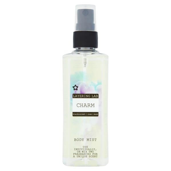 Product Information:Fancy creating your own unique scent? Say hello to the ever so Charm Layering Lab Body Mist! Floral with a hint of sweet fruits, it's simply delicious!,Features:Discover Superdrug Layering Lab body mists! A playful fragrance range with on-trend scents. Spritz and layer two mists for your own personalised bespoke smell! A sweet and beautifully fragrant body mist which is Vegan, Cruelty Free & Dermatologically tested,Warning or Restrictions:Highly Flammable. Keep away from heat and flame. Use only as directed. Keep out of reach of children. Avoid contact with the eyes. If contact occurs, rinse well with clean water. Do not spray on, or near, polished or painted surfaces,Product Specification:Alcohol Denat., Aqua, Parfum, Glycerin, Ethylhexyl Methoxycinnamate, Ethylhexyl Salicylate, Butyl Methoxydibenzoylmethane, Alpha-Isomethyl Ionone, Benzyl Salicylate, Cinnamyl Alcohol, Citronellol, Geraniol, Hydroxycitronellal, Linalool,Product Uses:Use individually, or mix 2 fragrances proportionately to create your own personalised unique scent!,Recyclable:Bottle-plastic widely recycled Pump - Mixed not yet recycled
