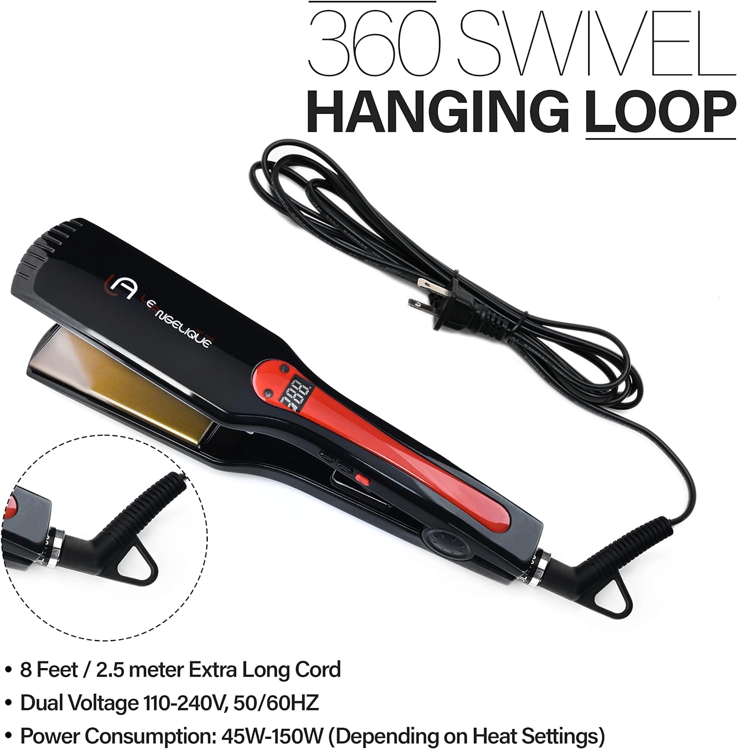 ABOUT THE PRODUCT: 1 > COVERS TWICE THE AMOUNT OF HAIR IN HALF THE TIME Uniquely designed for long thin and thick coarse hair types. 1.75 extra wide plates covers twice the amount of hair in half the time 2 > ELIMINATES FRIZZ WITH LESS DAMAGE Titan G3 generates heat using negative ions. Emitting negative ions into your hair helps to restore the balance of positive and negative ions and make your hair shiny, smooth and frizz-free. Because of this you don’t need it to be as hot in order to keep your hair straight. It retains heat so it can be used at a lower temperature than traditional ceramic or other metal options 3 > PRECISE HEAT CONTROL Stylists prefer titanium flat irons over all others because it is the highest quality metal on the market. Due to its titanium plates the Titan G3 is one of the fastest heating flat irons to date, although because of extra wide plates this model heats up in 30 seconds to 300F / 45 seconds to 400F / 60 seconds to 450F. With a wide range of temperature set from 122-450F you have a total control over the amount of heat you apply to your hairLe Angelique Titan G3 Nano Titanium Flat Iron 1.75 inch Extra Wide Styling Plates 450F to 120F Digital Temp Control Professional Titanium Plated Hair Straightener - Dual Voltage 110v-240v