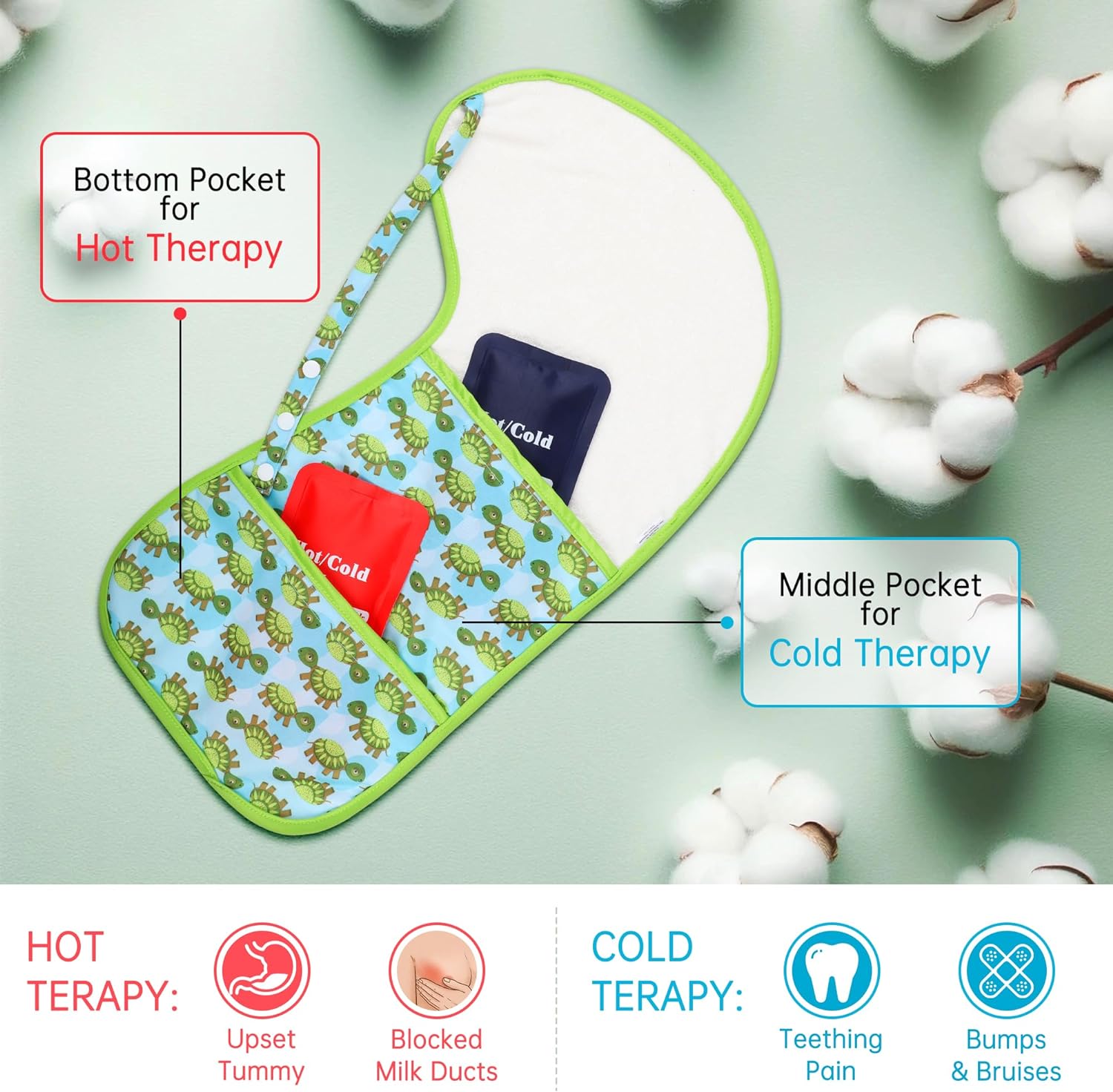 MULTIPURPOSE TREATMENT KITEach colic and fever kit includes 2 x snuggly and absorbent cotton burp cloths, perfect for dealing with drools, spills and spit-ups, plus 2 x hot/cold therapy clay pack inserts, which can be cooled down in the freezer or heated up in the microwave.We handpicked the softest organic cotton for our baby towels for newborn to cater to even the most sensitive skin. They are thick, fluffy, yet highly absorbent10INNOVATIVE DESIGN WITH SHOULDER STRAPSOur organic baby burp clothes for baby girls and baby boys, sized at 21.5" x 12", are wide enough to cover your shoulders. The unique shoulder straps design prevents the burp rags from slipping.We designed burp cloths to help you and your little one stay close, fresh and comfy and enjoy more bonding moments10NATURAL REMEDIES TO PROVIDE RELIEFReusable ice pack can provide targeted hot or cold therapy. Put the ice pack in the storage bag included and cooling it in freezer at least 2 hours for helping relief temperatures, inflammation, and teething pain. Heating the ice pack in microwave 15-20 seconds for heat for colic and upset tummy10INSTANT LOCALIZED RELIENaturally soothes fever, teething pain, colic, upset tummies and minor bumps and bruises in fussy babies, toddlers and young children. Apply the hot or cold pack directly to the face or chest to help reduce fever, or to ice bruises and bumps10MUST-HAVE ITEM FOR NEW MAMAA multipurpose treatment kit that uses hot and cold therapy in combination with specially designed burp cloths to soothe a variety of baby ailments, particularly colic and fever, and help nursing moms to ease breastfeeding ailments, like blocked milk ducts or engorgement.Get the clean look and enjoy staying clean all day long with our baby bibs & burp cloths