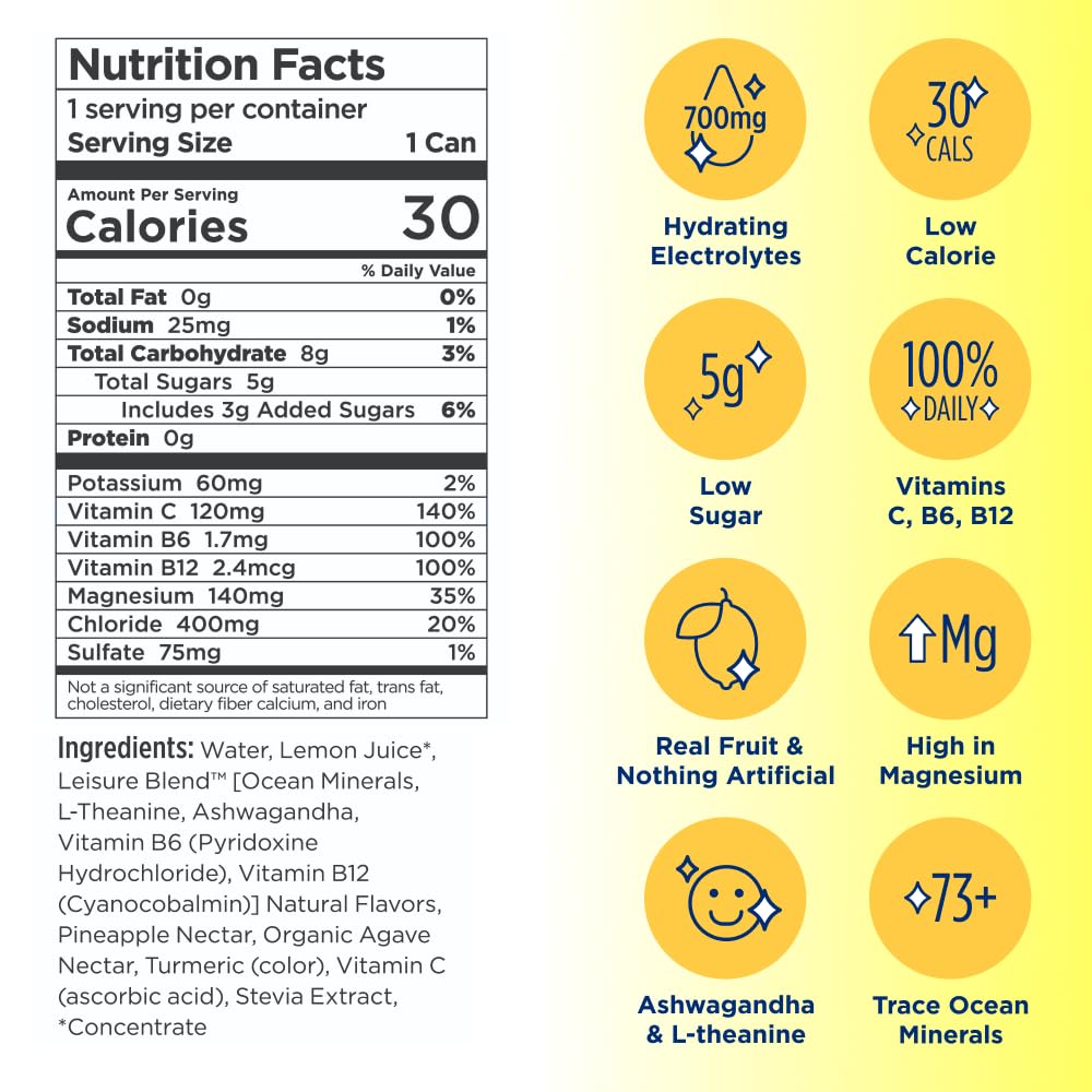 Leisure Drinks - Lemonade Electrolyte Drink [Electrolyte Refresher - 16Oz Cans, 12Pk] - Low Sugar Lemonade Hydration Drink - Healthy Hydration Packed W/ Magnesium & Ashwagandha For Mood & Stress Support