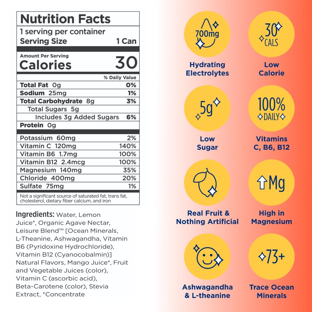 Leisure Project Electrolyte Refresher, Tropical Mango (16Oz Cans, 12 Pack) Mango Hydration Drink W/Magnesium & Ashwagandha For Mood & Stress Support, Low Sugar Drink W/Real Fruit, Vitamins & Minerals