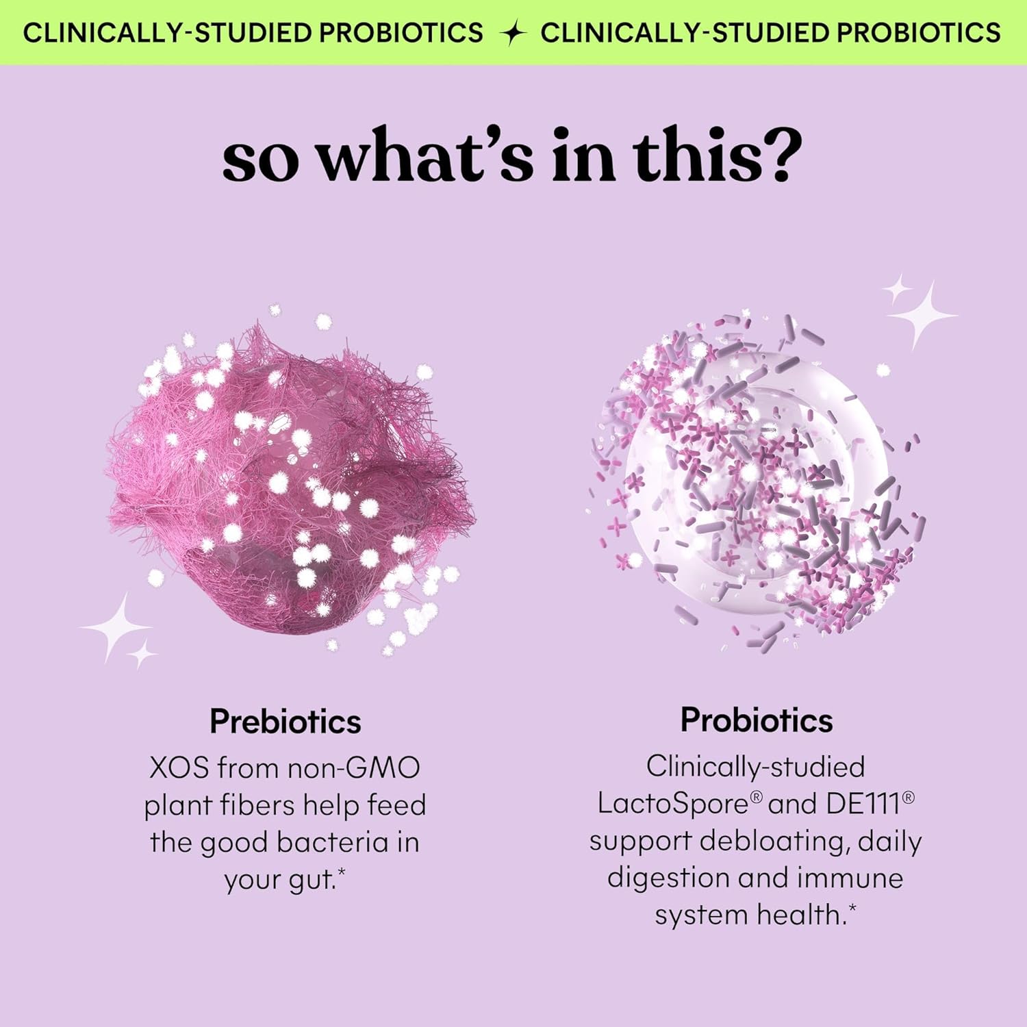 About this item DAILY GUT HEALTH: Feel your best after meals by reducing bloating and gas, aiding digestion and fueling a healthy gut microbiome with 2 clinically-studied probiotics & a powerful prebiotic.* CLINICALLY STUDIED PROBIOTICS: LactoSpore (Bacillus Coagulans) & DE111 (Bacillus Subtilis) are clinically shown to survive the harsh stomach environment & support a healthy gut microbiome.* POWERFUL PREBIOTIC: Xylooligosaccharides (XOS) sourced from non-GMO plant fibers help feed and maintain the balance of good bacteria in your gut.* REAL RESULTS: 2 gummies a day provide bloat relief when taken on a daily regimen. TRUSTED INGREDIENTS: Vegetarian, gluten-free, non-GMO, gelatin-free. No corn syrup, synthetic colors, or sugar alcohols. Made in the USA in a cGMP certified facility with locally and globally sourced ingredients. See more product details,DAILY GUT HEALTH: Feel your best after meals by reducing bloating and gas, aiding digestion and fueling a healthy gut microbiome with 2 clinically-studied probiotics & a powerful prebiotic,CLINICALLY STUDIED PROBIOTICS: LactoSpore (Bacillus Coagulans) & DE111 (Bacillus Subtilis) are clinically shown to survive the harsh stomach environment & support a healthy gut microbiome,POWERFUL PREBIOTIC: Xylooligosaccharides (XOS) sourced from non-GMO plant fibers help feed and maintain the balance of good bacteria in your gut,REAL RESULTS: 2 gummies a day provide bloat relief when taken on a daily regimen,TRUSTED INGREDIENTS: Vegetarian, gluten-free, non-GMO, gelatin-free. No corn syrup, synthetic colors, or sugar alcohols. Made in the USA in a cGMP certified facility with locally and globally sourced ingredients