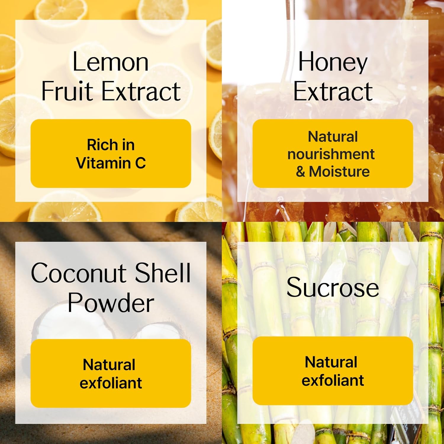 Powered by Nature: Features premium natural ingredients like Vitamin C-rich Lemon Extract, New Zealand Manuka Honey, Eco-friendly Coconut Shell Powder, and Sucrose to refresh, smooth, and nourish your skin for a naturally healthy glow