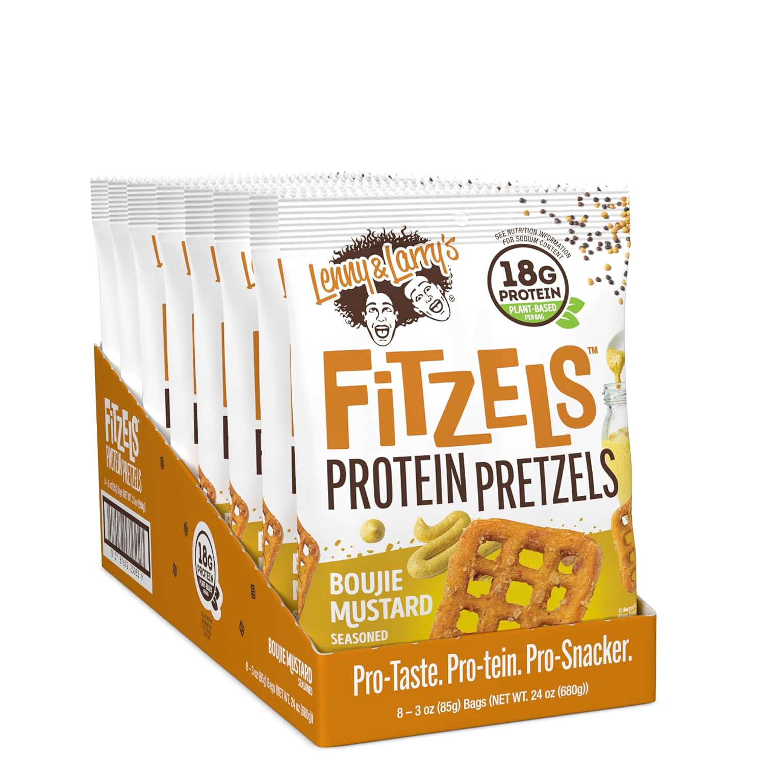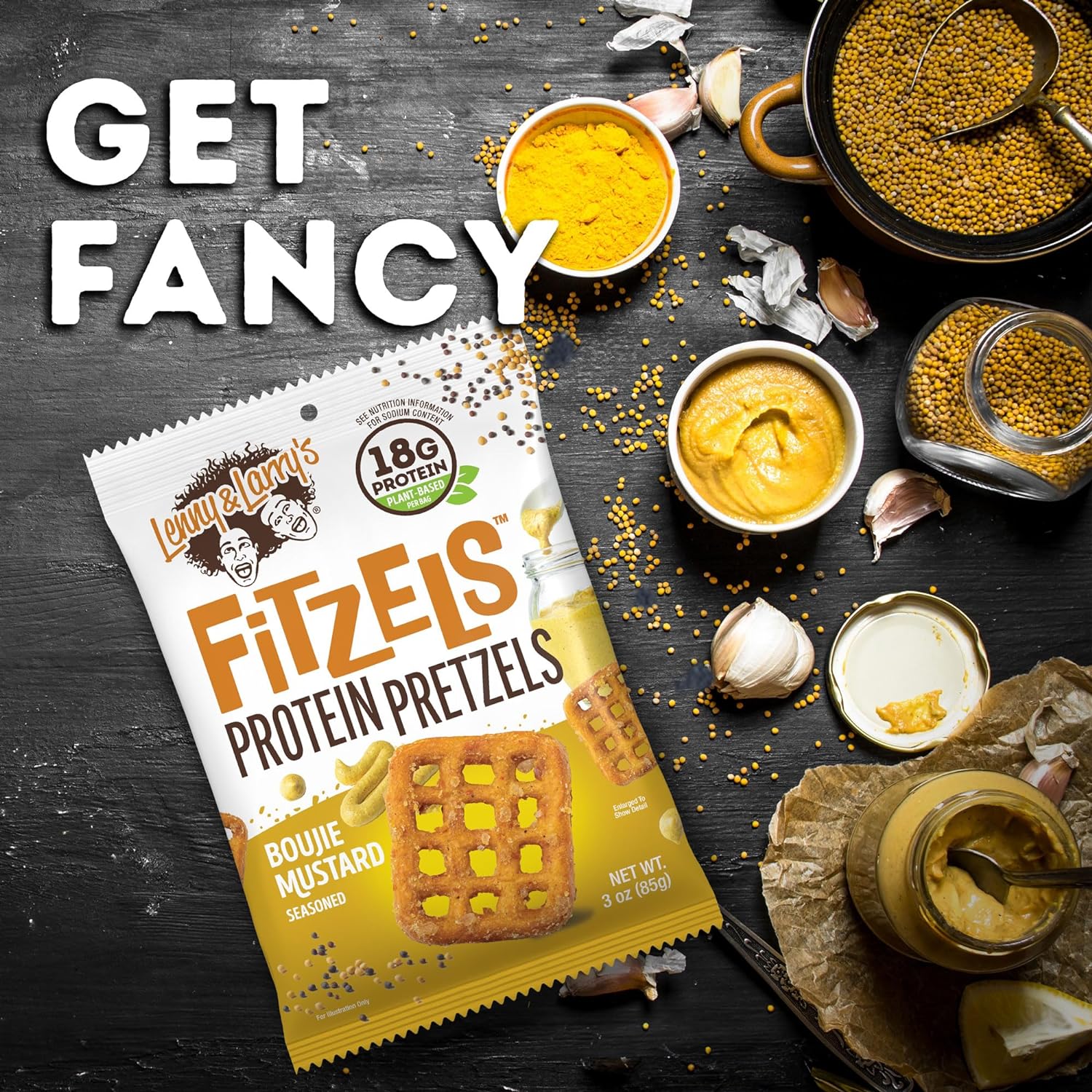 Fitness + Pretzels = FITZELS. It’s a snack. It’s a meal. FITZELS are an incredibly delicious, high protein pretzel that is so much better than a chip, both for you and tasting!Get fit with 18g of plant-based protein per bag. Made from simple ingredients, FITZELS are a convenient on-the-go source of protein for wherever your snacking desires take youGet fancy with our Bougie Mustard with a peppery mustard seasoning that’s got a bit of a horseradish flavor with a mild heat, think Chinese Hot Mustard! Absolutely deliciously savory. Pinky’s Up!We went on a quest to create the tastiest, yummiest, most protein dense salty snack on the market! The result? FITZELS are Certified Vegan & Kosher and offer bold flavor for everyone!Each box has 8-3oz bags and 18g protein per bag, Vegan, Kosher, No soy ingredients, No high fructose corn syrup, No artificial sweeteners, 0g sugar alcoholsSalty, Savory, Delicious, Addictive, Better than high protein chips we guarantee it! Our Fit-Pretzles contain 18g protein per bag, and are Vegan, Kosher, No soy ingredients, No high fructose corn syrup, No artificial sweeteners, 0g sugar alcohols. Even we grow tired sometimes of the standard answer to a snack thats a reliable source of protein. We made it a goal to create an alternative to the "meh" protien chips that are the salty go to of the moment. We wanted to make it tastier, different and full of that Lenny & Larry's inquisitive spritit you are used to, and we deliver big time. We can't wait for you to try these, we have never been more proud of our baking quest to bring you a protein snack that tastes like its not